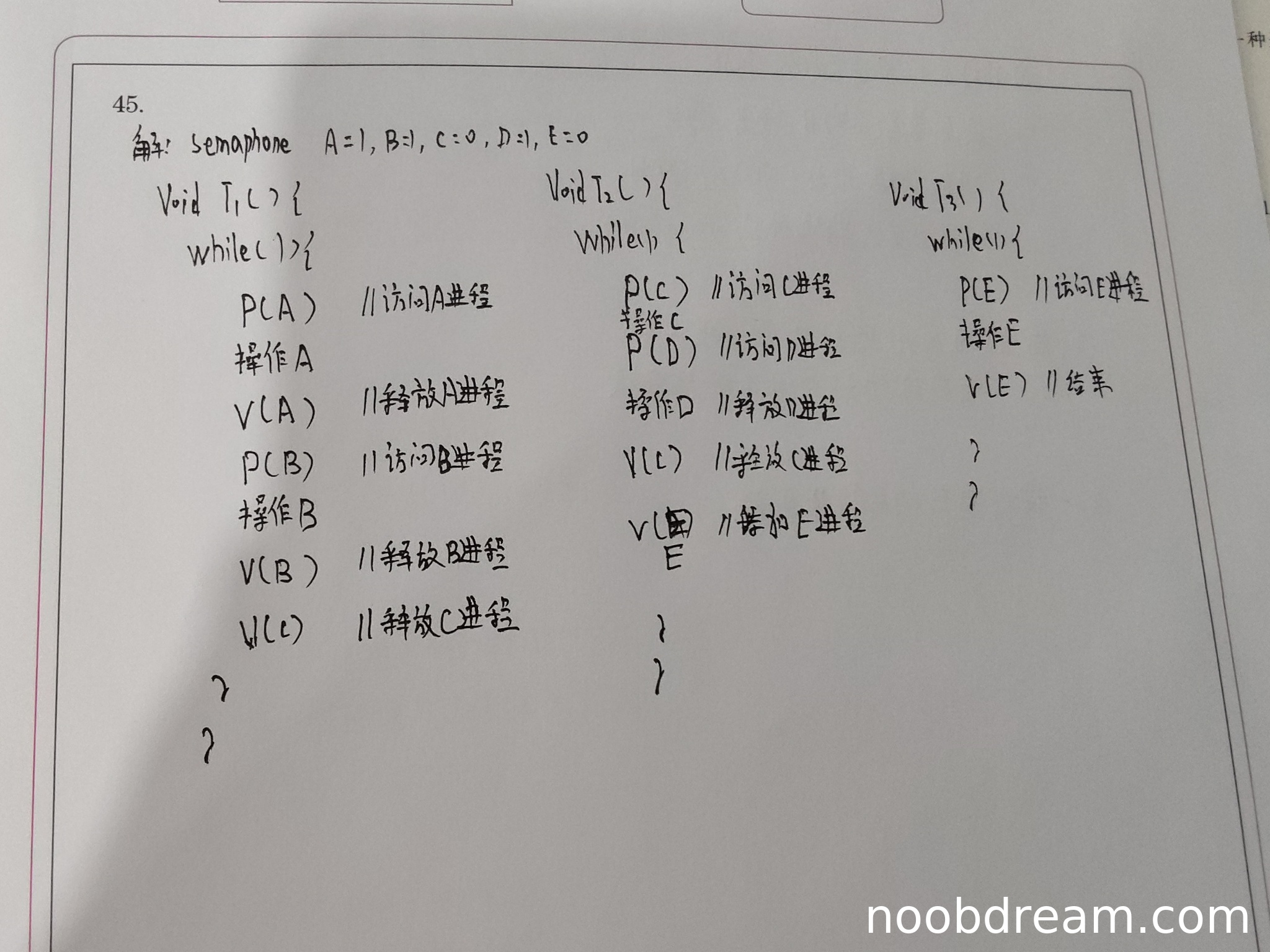 学生定义了5个信号量A、B、C、D、E,初值分别为1、1、0、1、0。虽然信号量命名与标准答案不同,但初值设置基本合理:C和E作为同步信号量初值为0符合要求。但A、B、D初值为1实际上将其用作互斥信号量,而题目要求的是同步关系,这里存在逻辑偏差。扣0.5分。