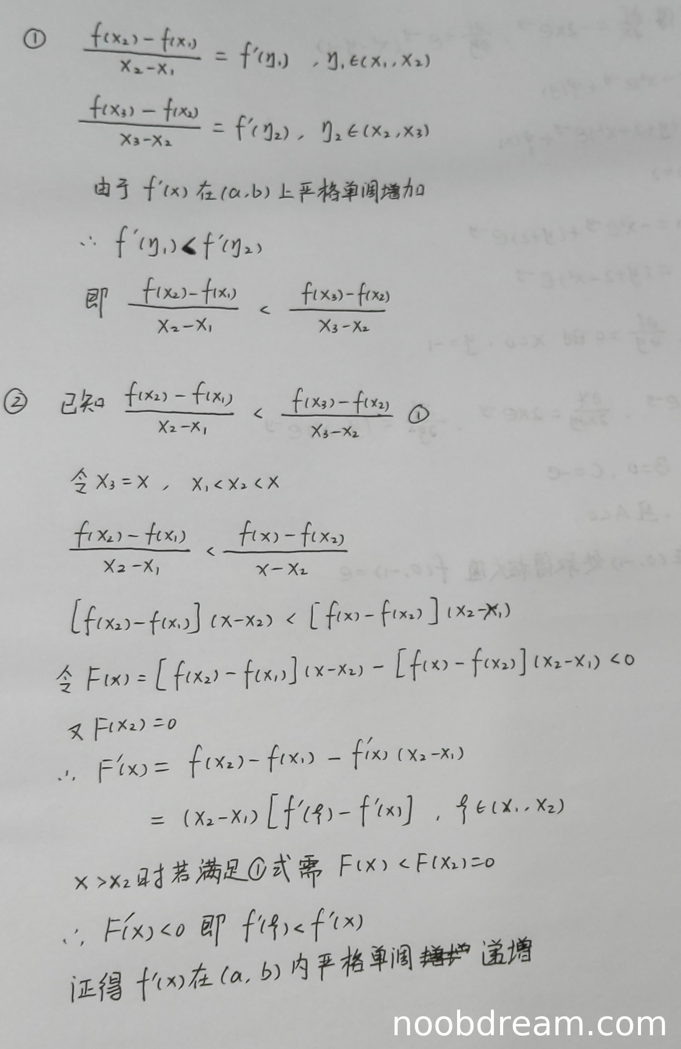 学生第二部分证明了充分性:已知不等式成立,推出导函数严格单调增加。但该部分存在逻辑错误:
