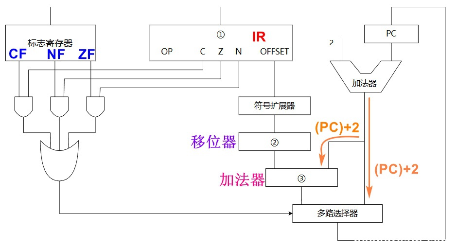 若该指令执行时 CF=0, ZF=0, NF=1,由题中得知相对偏移量 OFFSET 为 11100011,OFFSET * 2 得到 11000110,由于 OFFSET 用补码表示故应该使用符号位拓展,得到 FFC6H,则该指令执行后 PC 的值是 200CH + 2 + FFC6H = 1FD4H;若该指令执行时 CF=1,ZF=0,NF=0,此时不转移,则该指令执行后 PC 的值是 200CH + 2 = 200EH