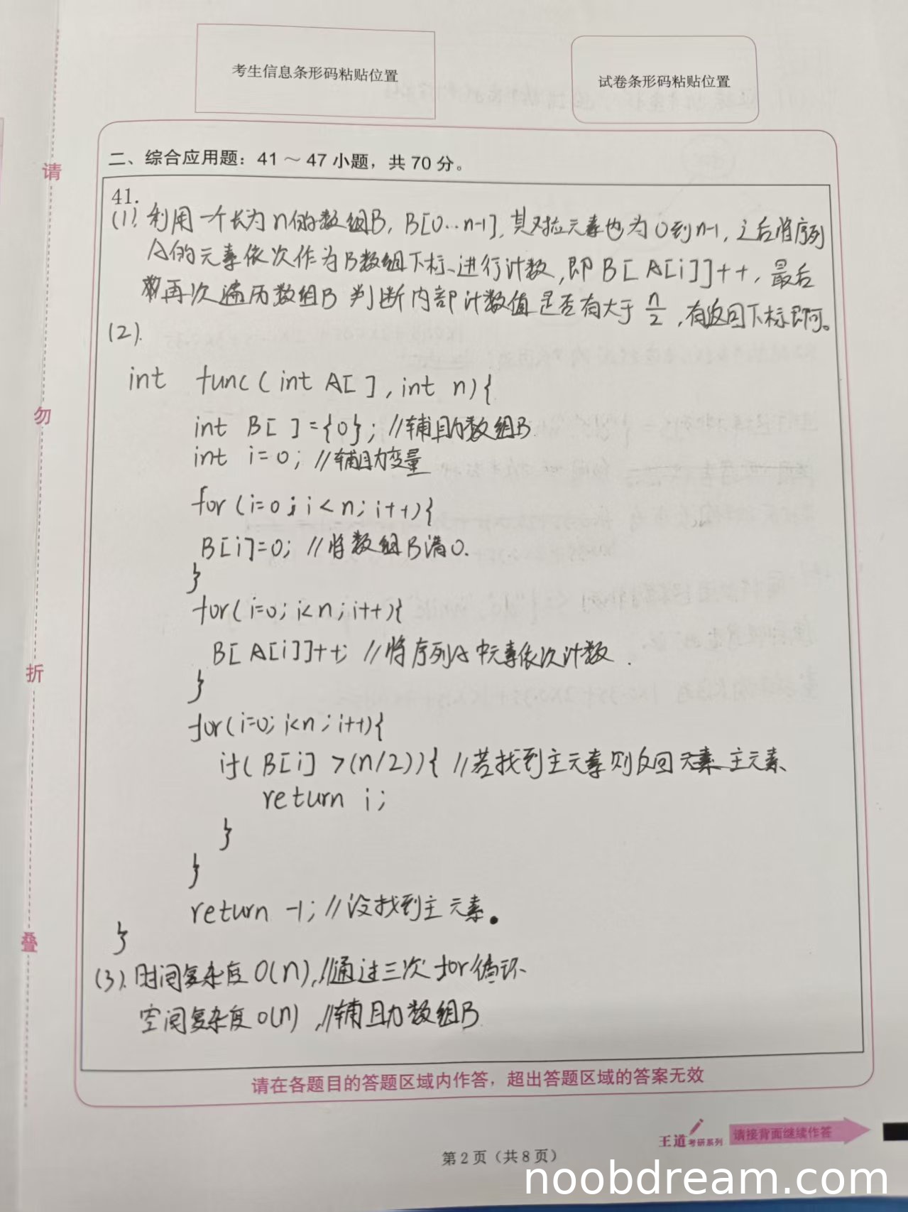 理由:学生的算法设计思想清晰,使用辅助数组统计每个元素的出现次数,然后遍历查找出现次数超过n/2的元素。这种方法能够正确找出主元素,思路正确且完整,与标准答案的摩尔投票法不同但同样有效。