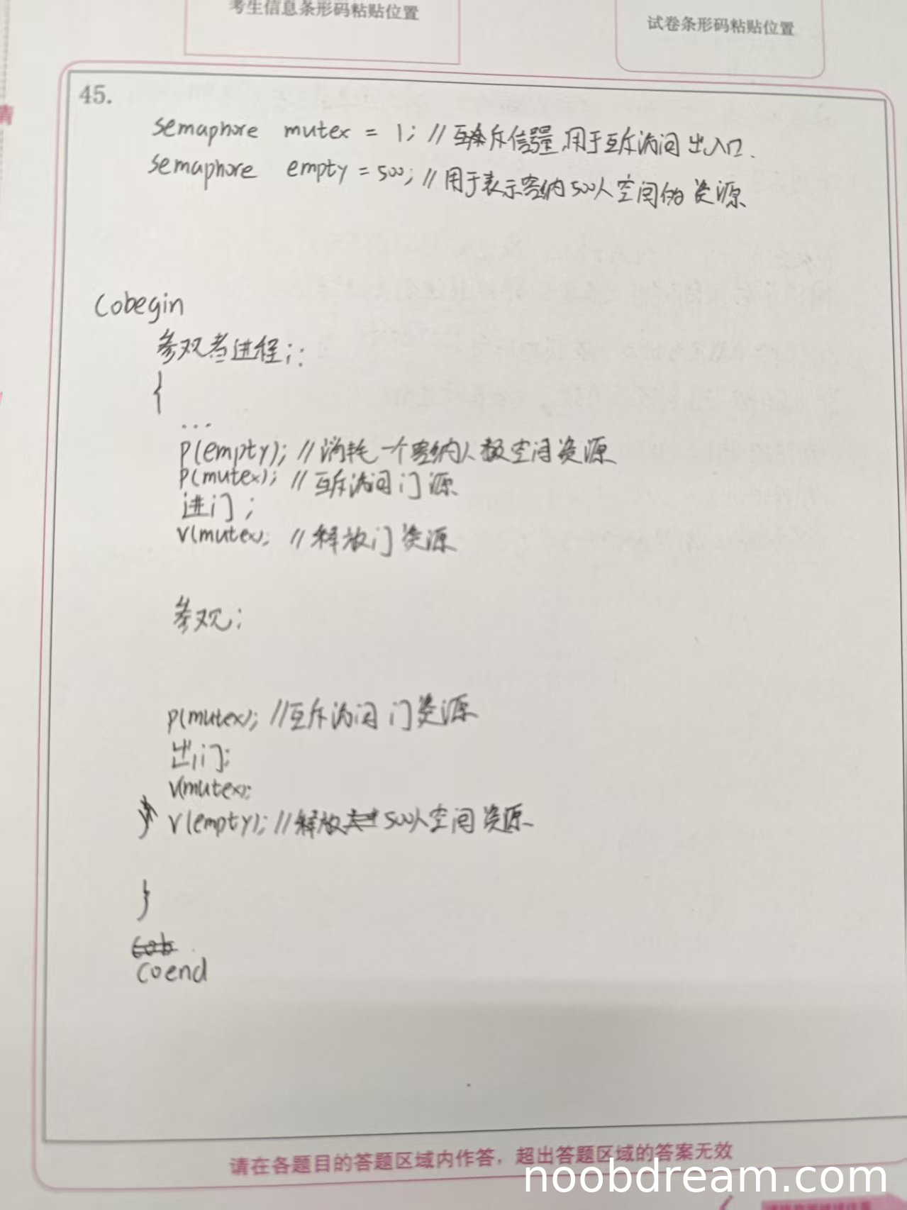 理由:学生对mutex信号量的使用完全正确,在进门和出门操作前后都正确使用了P(mutex)和V(mutex)操作,实现了出入口的互斥访问。