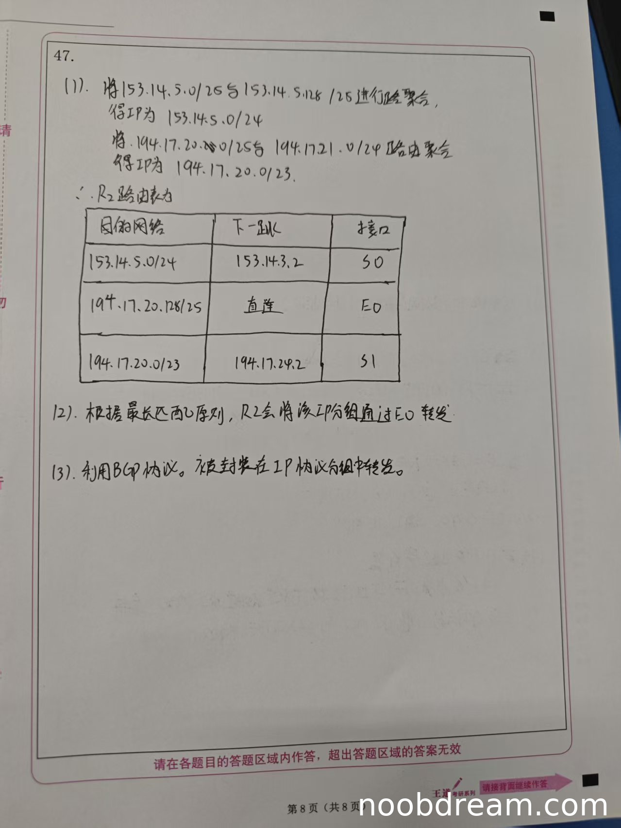 这些路由项与标准答案完全一致,且使用了路由聚合技术,路由项数量最少(3条)。根据评分标准,每条路由项正确得2分,共6分。