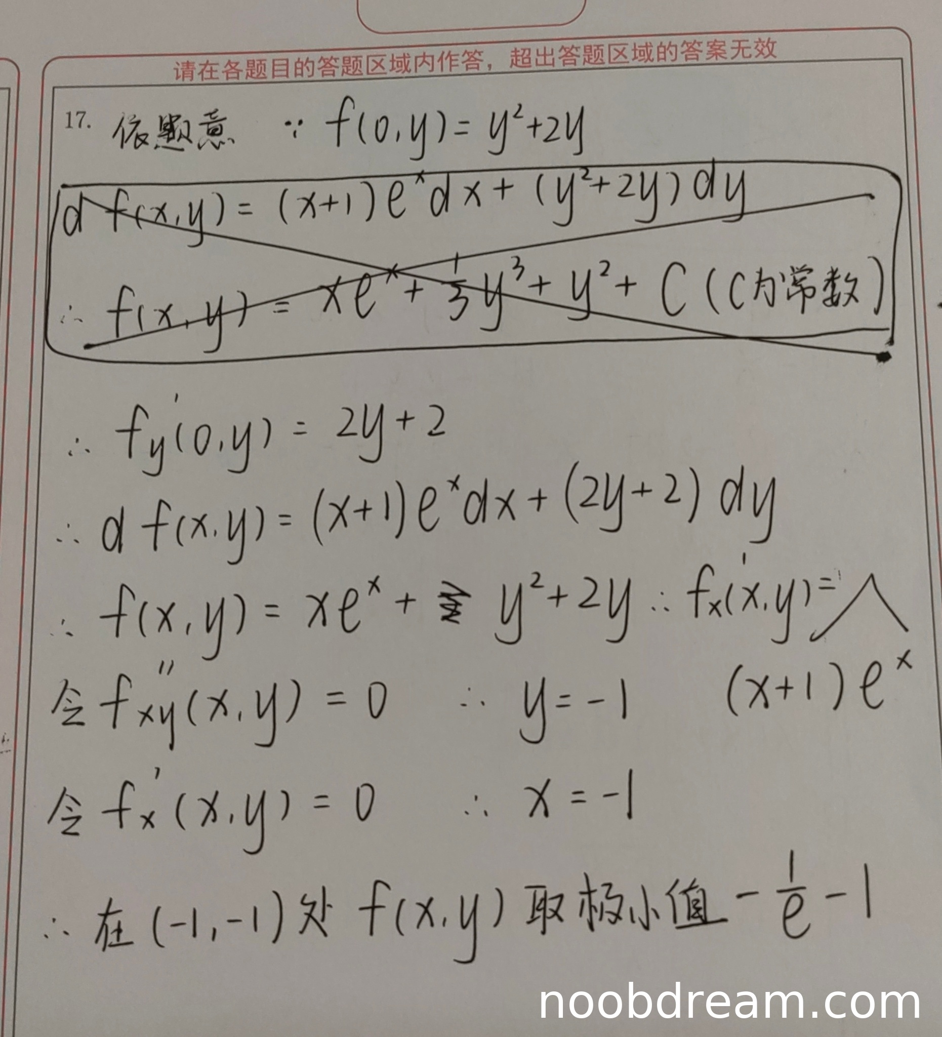 - 第三步求驻点时,误将 \(f_{xy}''=0\) 作为条件(第二次识别中已修正为 \(f_y'=0\)),但偏导数计算错误(正确应为 \(f_x'=(y^2+2y)e^x+(x+1)e^x\))。