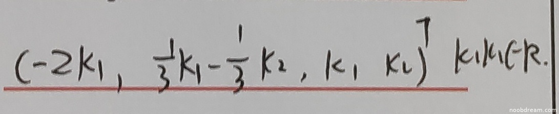 学生答案:第1次识别结果为 \((-2k_{1},\frac{1}{3}k_{1}-\frac{1}{3}k_{2},k_{1}k_{2})^{T}\),第2次识别结果为 \((-2k_1,\frac{1}{3}k_1 - \frac{1}{3}k_2,k_1,k_2)^T\)。标准答案为 \( k_1 \begin{pmatrix} -\frac{5}{3}, \frac{1}{3}, 1, 0 \end{pmatrix}^T + k_2 \begin{pmatrix} -\frac{1}{3}, -\frac{1}{3}, 0, 1 \end{pmatrix}^T \)。