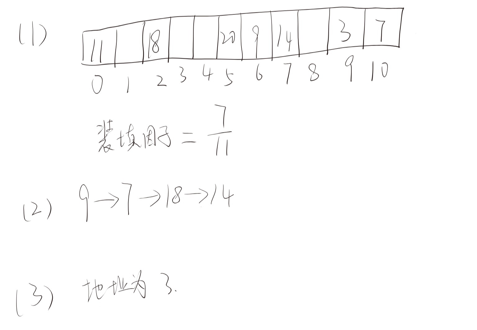学生只给出了中间探查地址3,没有给出最终的失败地址7,答案错误,本小题得0分。