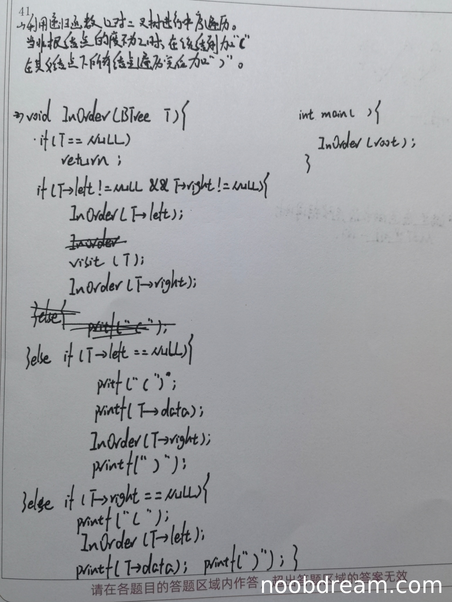 理由:学生的基本设计思想提到了使用中序遍历,这是正确的。但是关于括号添加的条件"当非根结点的度不为2时"存在逻辑错误。正确的括号添加条件应该是根据当前结点在表达式树中的深度(是否为根结点)以及操作符优先级关系来决定,而不是简单地根据结点的度数。这个错误思路会导致括号添加不正确。