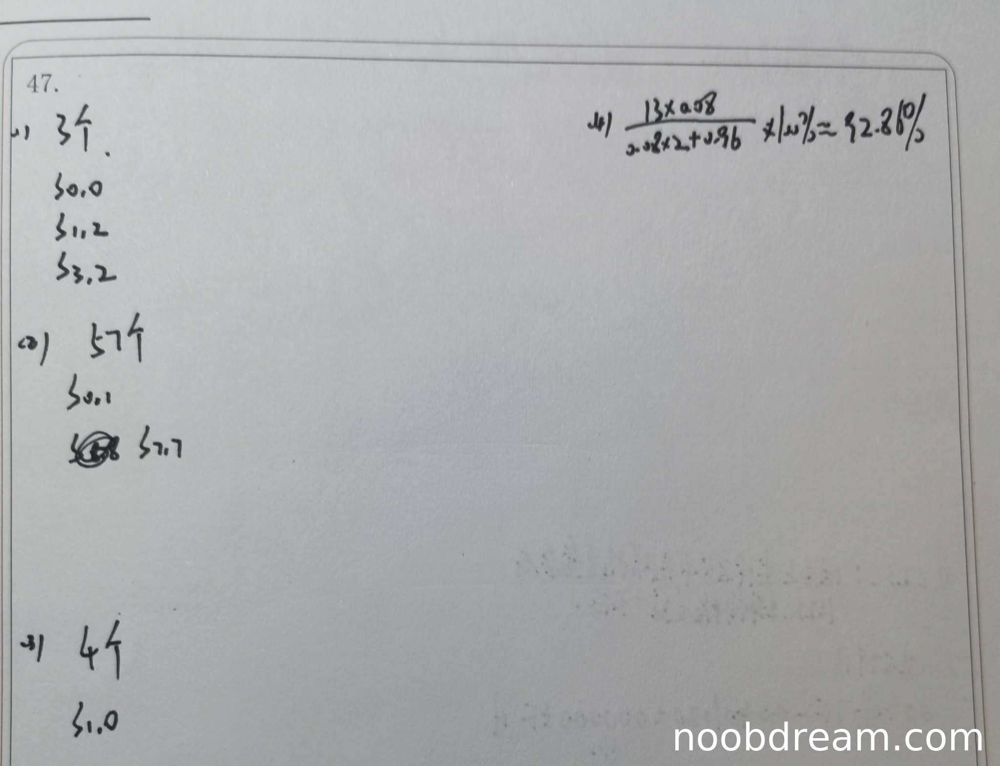 学生给出的计算式$\frac{13\times0.08}{0.08\times2 + 0.96}\times100\%=32.8\%$中,分子13×0.08错误(应为7×0.08),分母计算也不正确。计算结果32.8%与标准答案50%相差较大,得0分。