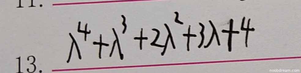 学生两次识别结果均为 \(\lambda^{4}+\lambda^{3}+2\lambda^{2}+3\lambda + 4\),与标准答案完全一致。根据评分要求,答案正确应给满分。虽然题目是填空题,但学生答案在数学表达式、系数和符号方面均无任何错误,符合标准答案要求。