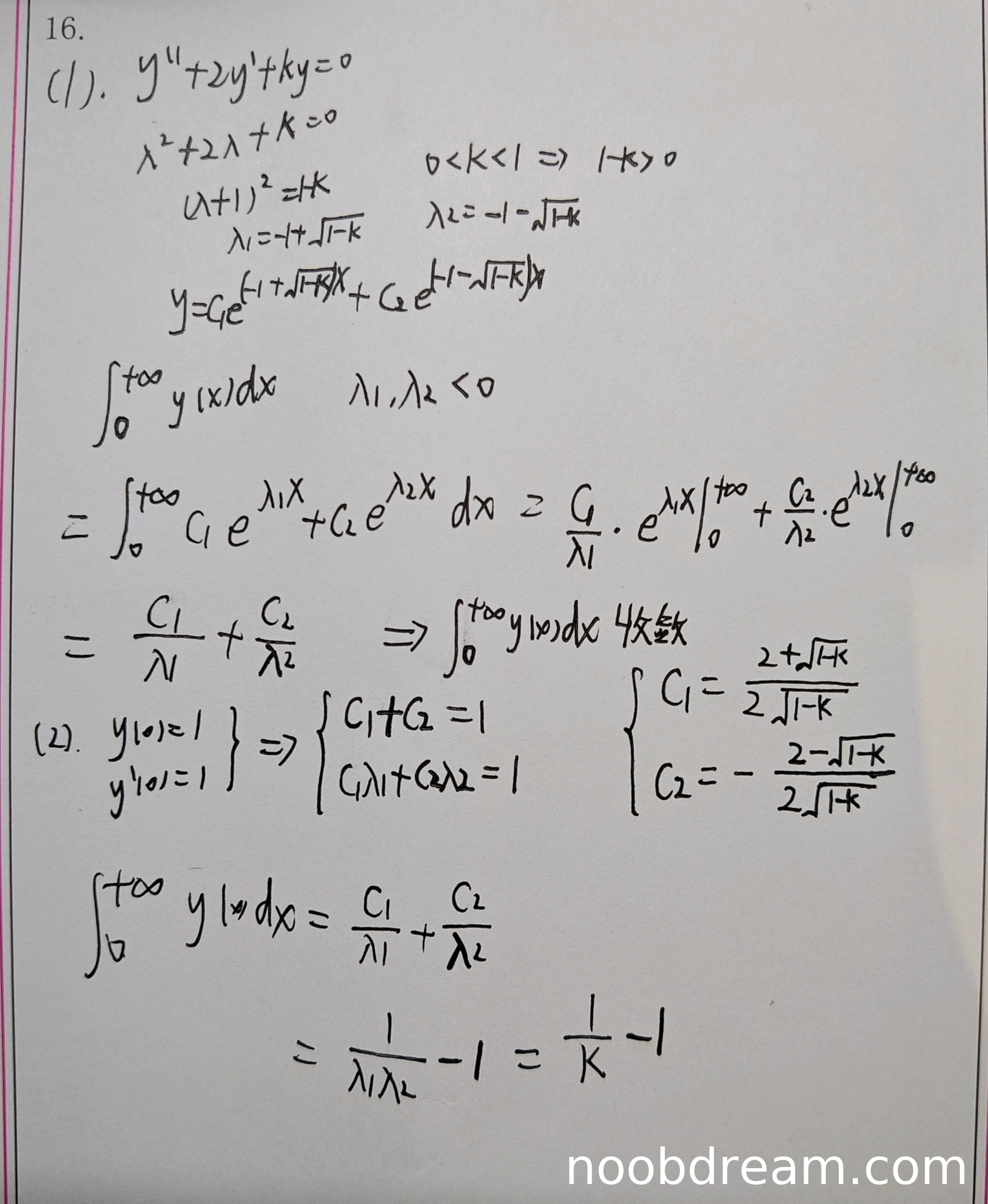 学生正确求解了特征方程,得到两个负实根,并指出由于指数衰减性质,反常积分收敛。思路与标准答案一致,证明完整。得5分。