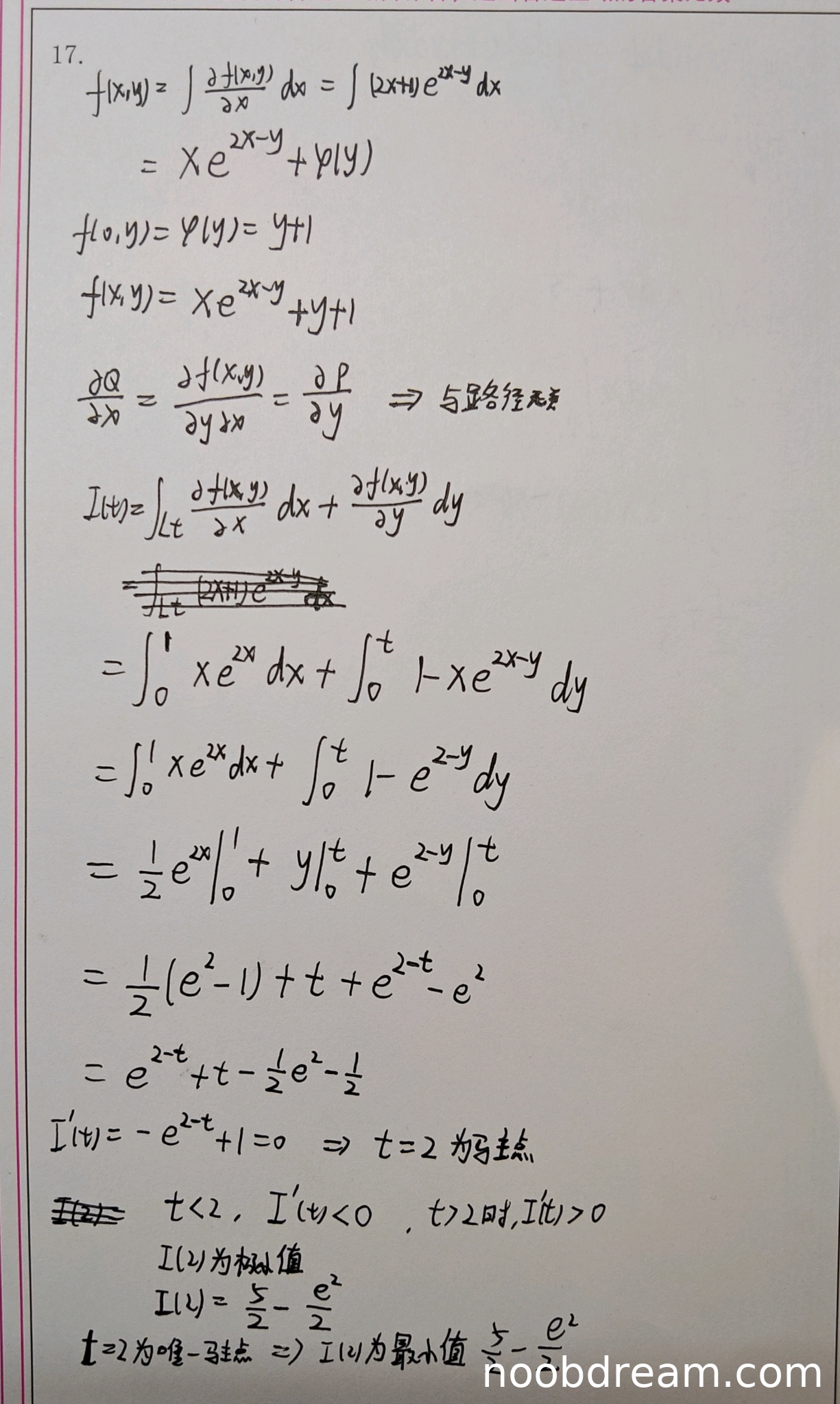 理由:学生正确识别出f(x,y)应包含一个关于y的函数φ(y),并正确利用f(0,y)=y+1的条件。但在第一步积分时出现严重错误:将∂f/∂x误写为(2x+y)e^(2x-y)(应为(2x+1)e^(2x-y)),这导致后续所有计算都基于错误的前提。由于思路正确但核心计算错误,给1分。