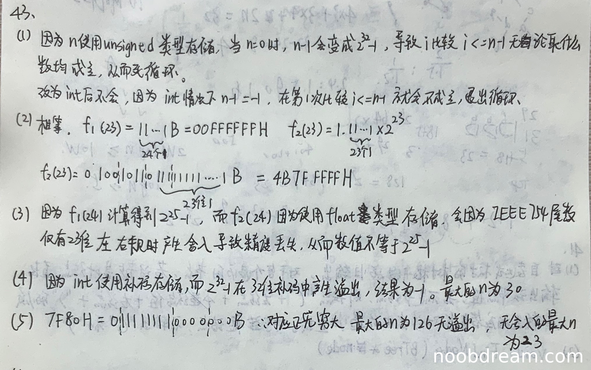 学生正确指出7F800000H对应正无穷大。无溢出最大n=126正确,无舍入最大n=23正确。得3分。