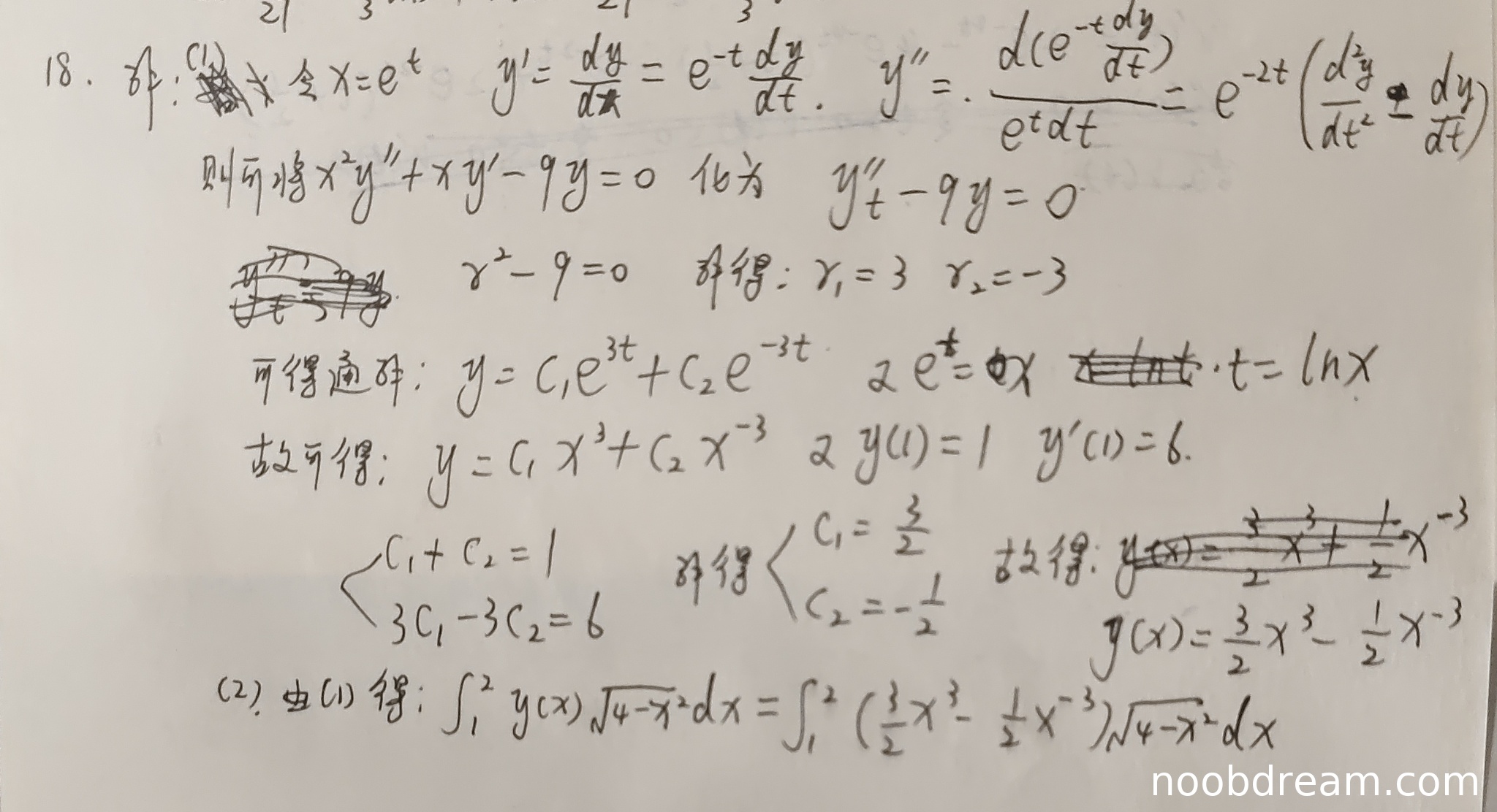 学生正确使用了变换 \(x = e^t\) 并推导出了化简后的方程 \(y''_t - 9y = 0\),特征方程求解和通解形式正确。但在利用初始条件时,将 \(y(1) = 2\) 误写为 \(y(1) = 1\),导致后续常数求解错误。具体步骤: