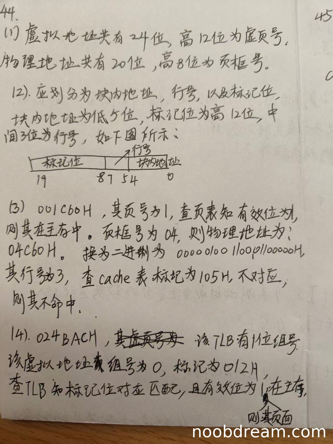 学生正确判断虚拟地址001C60H在主存中(页号为1,有效位为1),物理地址为04C60H,并正确计算行号为3,但标记位比较时写为105H(标准答案为064H)。这里可能是识别错误或计算错误,但核心逻辑正确(指出不命中)。扣1分。得3分。