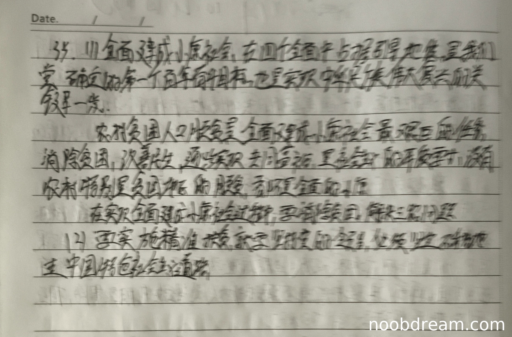 与标准答案相比,学生答案缺少了对共享发展理念的明确表述,以及"小康不小康,关键看老乡"这一重要表述。但核心要点基本涵盖,逻辑清晰。