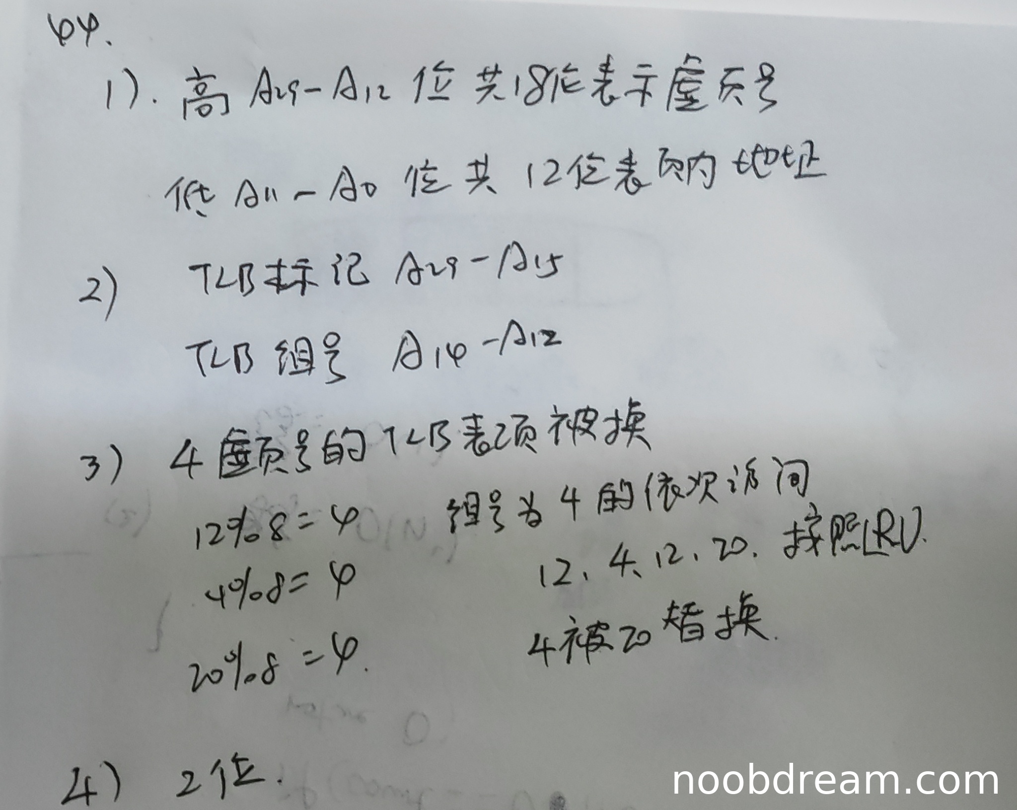学生第一次识别结果中,虚页号描述为"A19 - A12位共18位",但A19-A12是8位,此处可能是识别错误或表述不清;第二次识别结果中,虚页号描述为"A19 - A12位共8位",但实际虚页号应为18位。两种识别结果均未正确给出虚页号位数和页内地址位数,且未正确说明虚拟地址的位数分配。根据标准答案,虚页号应为高18位,页内地址为低12位。学生答案存在逻辑错误,扣2分。得分:0分。