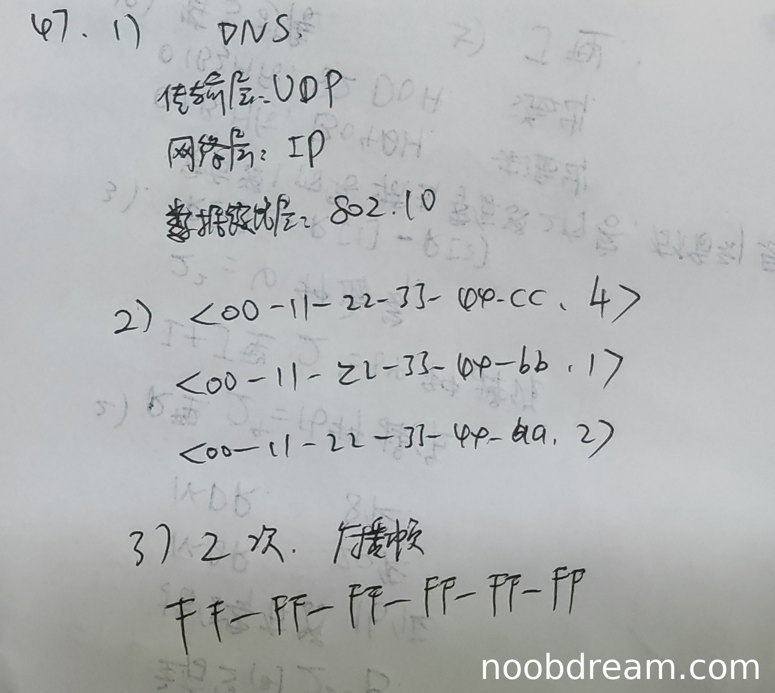 学生正确指出了应用层协议为DNS,传输层协议为UDP,网络层协议为IP,这些与标准答案一致。但在数据链路层协议上,学生写的是"802.10",这可能是对"802.3"的误写,因为标准答案中明确指出是CSMA/CD帧(即以太网帧,对应IEEE 802.3)。考虑到题目要求对识别错误和误写不扣分,且核心逻辑正确,因此不扣分。得3分。