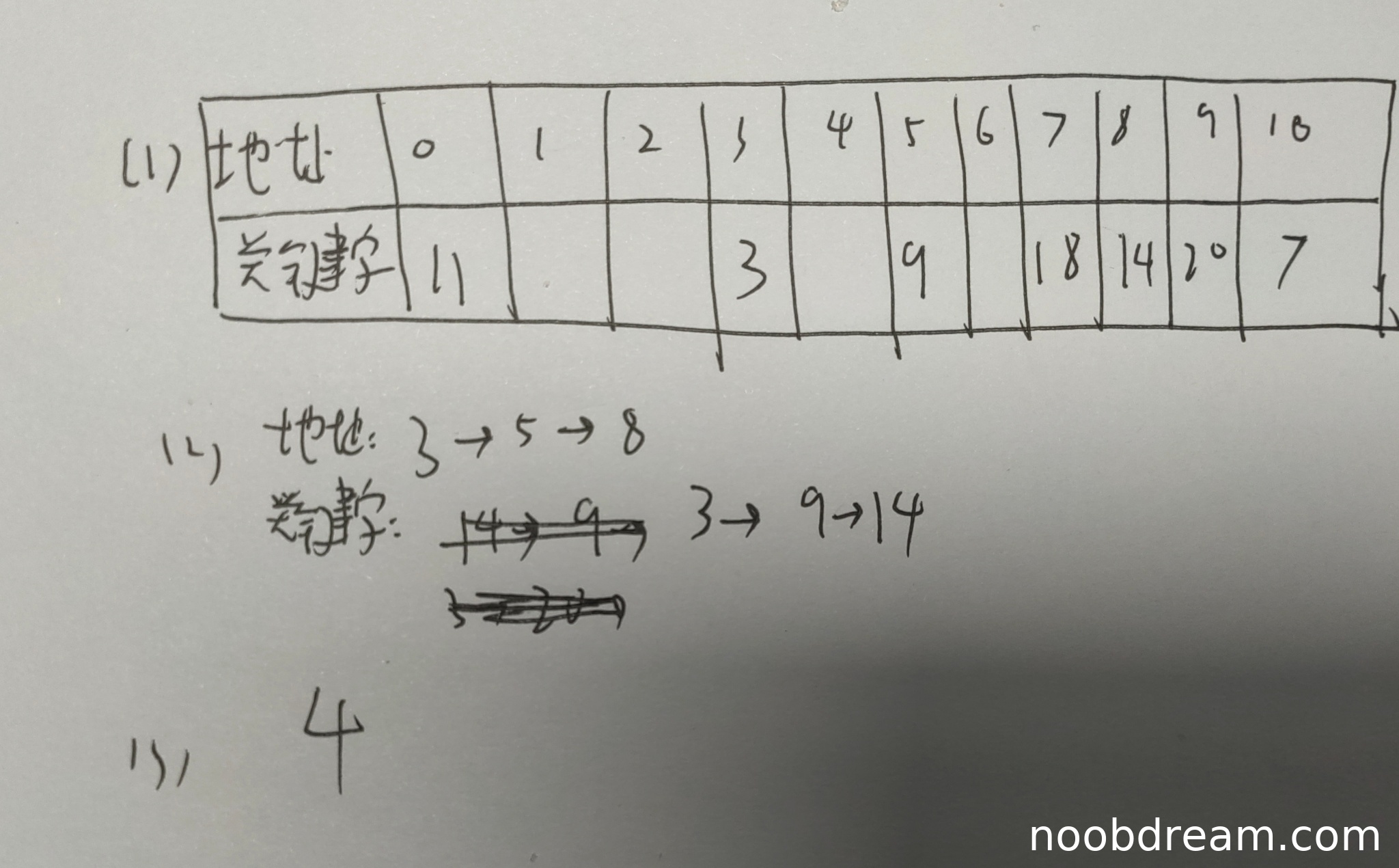 学生第二次识别结果中查找关键字14的地址比较序列为3→5→8,但标准答案为3→8→2。学生序列中的地址5未在标准答案中出现,且最终找到地址8(实际应为地址2),存在逻辑错误。但考虑到识别可能将"2"误写为"5"(字符相似),且比较序列长度和部分地址正确,扣1分。因此本小题得1分。