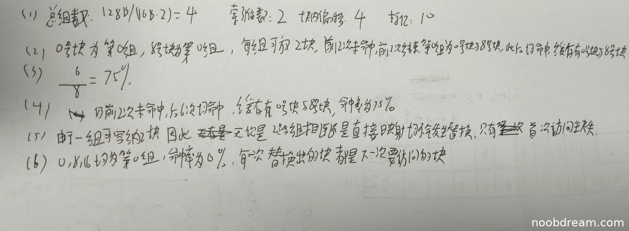 学生答案错误地认为直接映射下命中率为75%,但标准答案为0%。学生未理解直接映射中块0和块8冲突导致每次访问缺失的逻辑。扣4分。