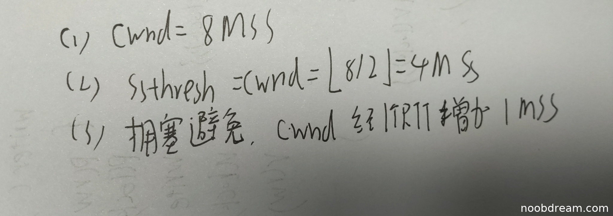 学生答案正确给出了快速重传触发时的ssthresh调整值为4 MSS,这与标准答案一致(ssthresh = max(拥塞窗口/2, 2) = 4 MSS)。但是,学生答案中cwnd的调整写为“Ssthresh = Cwnd = ⌊8/2⌋ = 4MSS”,其中“Cwnd =”部分可能为笔误或识别错误,因为标准答案中cwnd在快速重传后应调整为ssthresh + 3 MSS = 7 MSS,而学生未明确写出调整后的cwnd值。考虑到识别可能导致的误写(如将“cwnd调整为”误识别为“Cwnd =”),且核心逻辑中ssthresh计算正确,但cwnd调整值缺失,因此扣1分。得2分。