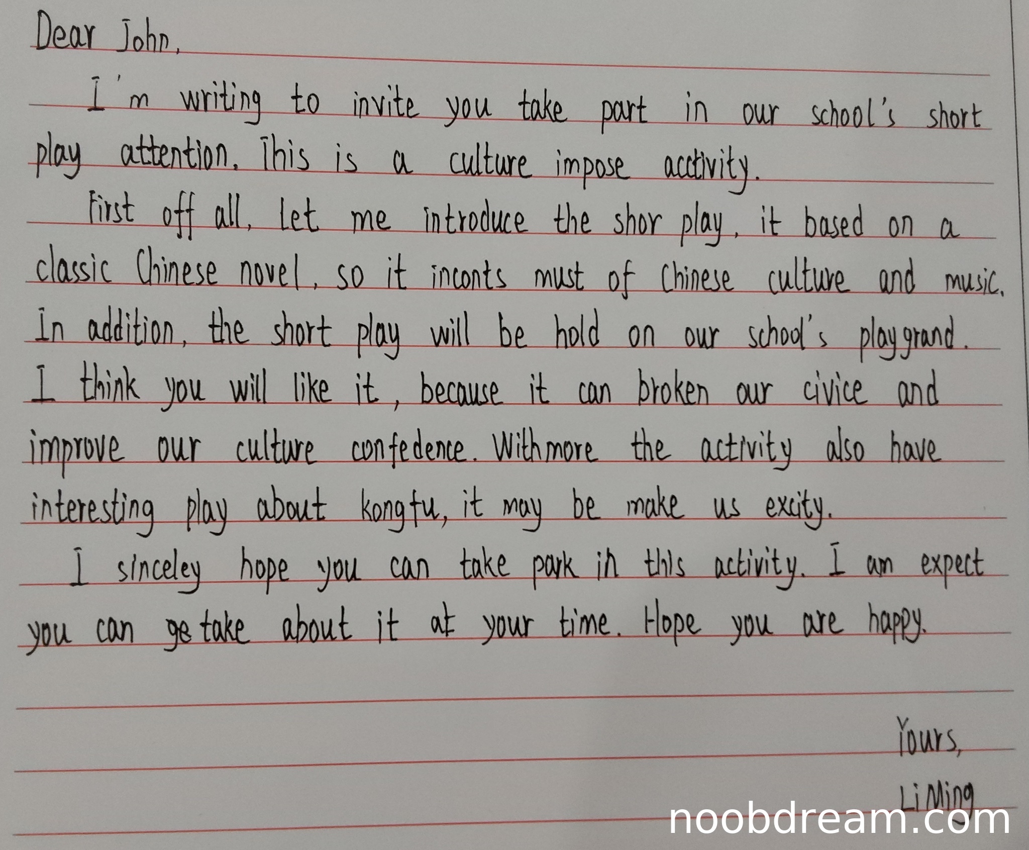 得分:2分。理由:存在大量语法和词汇错误,包括:"invite you take part"(缺少to)、"culture impose activity"(应为cultural activity)、"First off all"(应为First of all)、"shor play"(拼写错误)、"It based on"(缺少is)、"will be hold"(被动语态错误)、"broken our civice"(意义不明)、"culture confedence"(拼写错误)、"Withmore"(应为Moreover)、"kongfu"(拼写)、"make us excity"(应为excite us)、"sinceley"(拼写错误)、"take park"(拼写错误)、"I am expect"(语法错误)等。虽然大部分内容仍可理解,但错误频率较高,影响了表达效果。