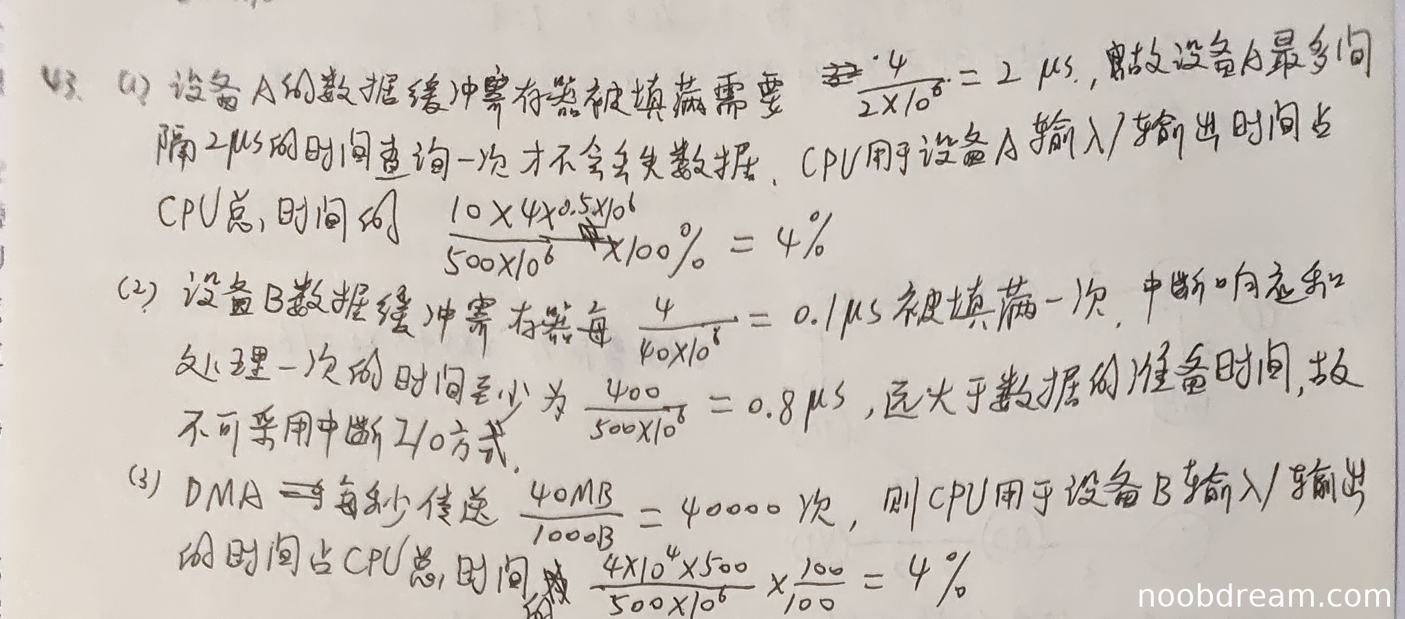 学生正确计算了设备A的数据缓冲寄存器填满时间:4B/2MBps = 2μs,并得出查询间隔为2μs。在计算CPU时间占比时,虽然表达式中的"0.5×10^6"应为"5×10^5"(对应每秒查询次数),但最终结果4%正确。考虑到识别可能产生的数字错误(如10^6与10^5的混淆),且最终结果与标准答案一致,给满分4分。