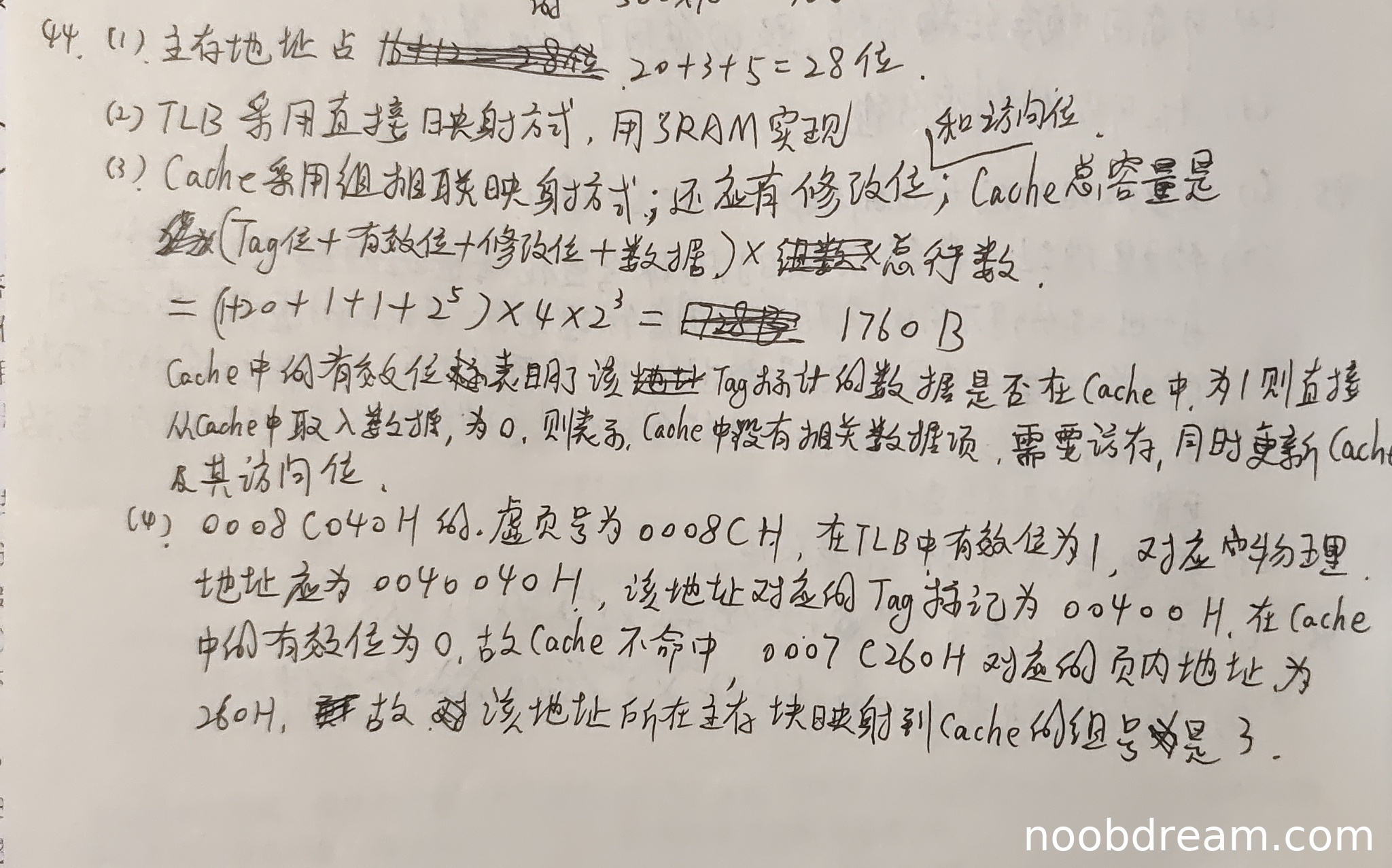 学生答案第一问正确计算出物理地址0040040H,得1分;第二问正确判断Cache不命中且理由合理,得2分;第三问正确得出组号3,得2分。本小题共得5分。