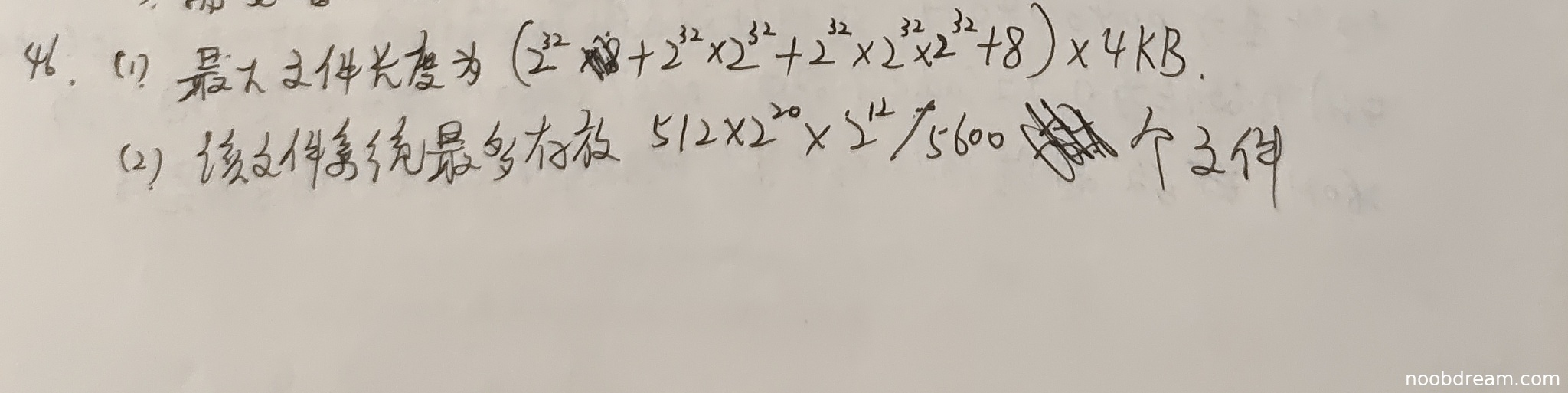 学生答案中给出的表达式为$512×2^{20}×2^{12}/5600$,其中512×2^20可能表示512M个簇(512×2^20),2^12可能表示4KB(2^12=4096B),但整体计算逻辑错误。标准答案需要分别计算索引节点限制的文件数(64M)和数据簇限制的文件数(256M),取最小值。学生答案直接使用数据簇总数乘以每簇大小除以文件大小,没有考虑索引节点数量的限制,且计算方式不符合簇分配逻辑(文件占2簇,应除以2而非5600)。核心逻辑错误,扣2分。