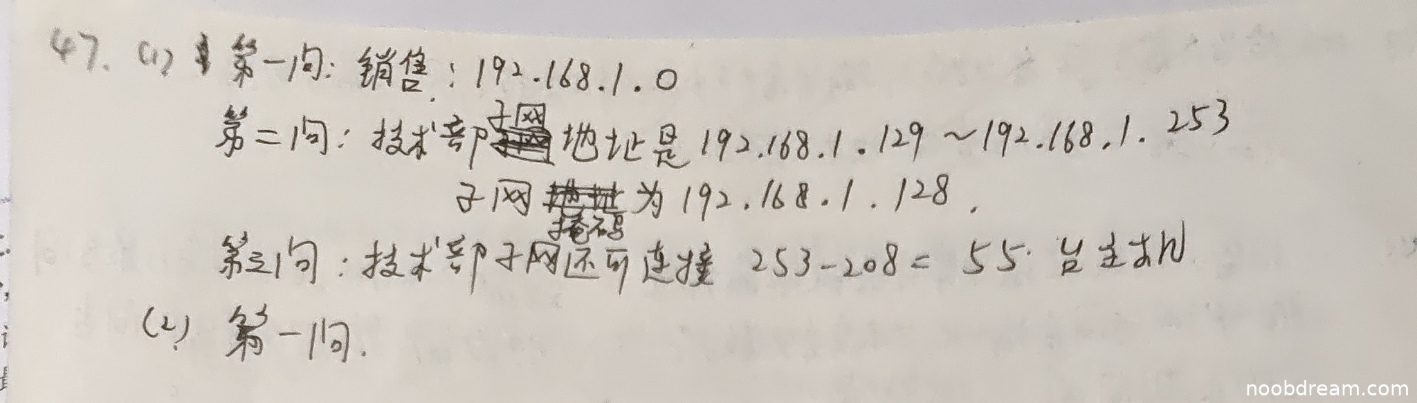 第三问:学生计算技术部子网还可连接55台主机,但标准答案为45台。学生计算方式为253-208=55,但技术部子网可用主机范围是192.168.1.129~192.168.1.254(共126个地址),已分配包括192.168.1.129~192.168.1.208和192.168.1.254(共81个地址),剩余45个。学生未考虑路由器接口192.168.1.254已占用,且范围计算有误。扣2分。