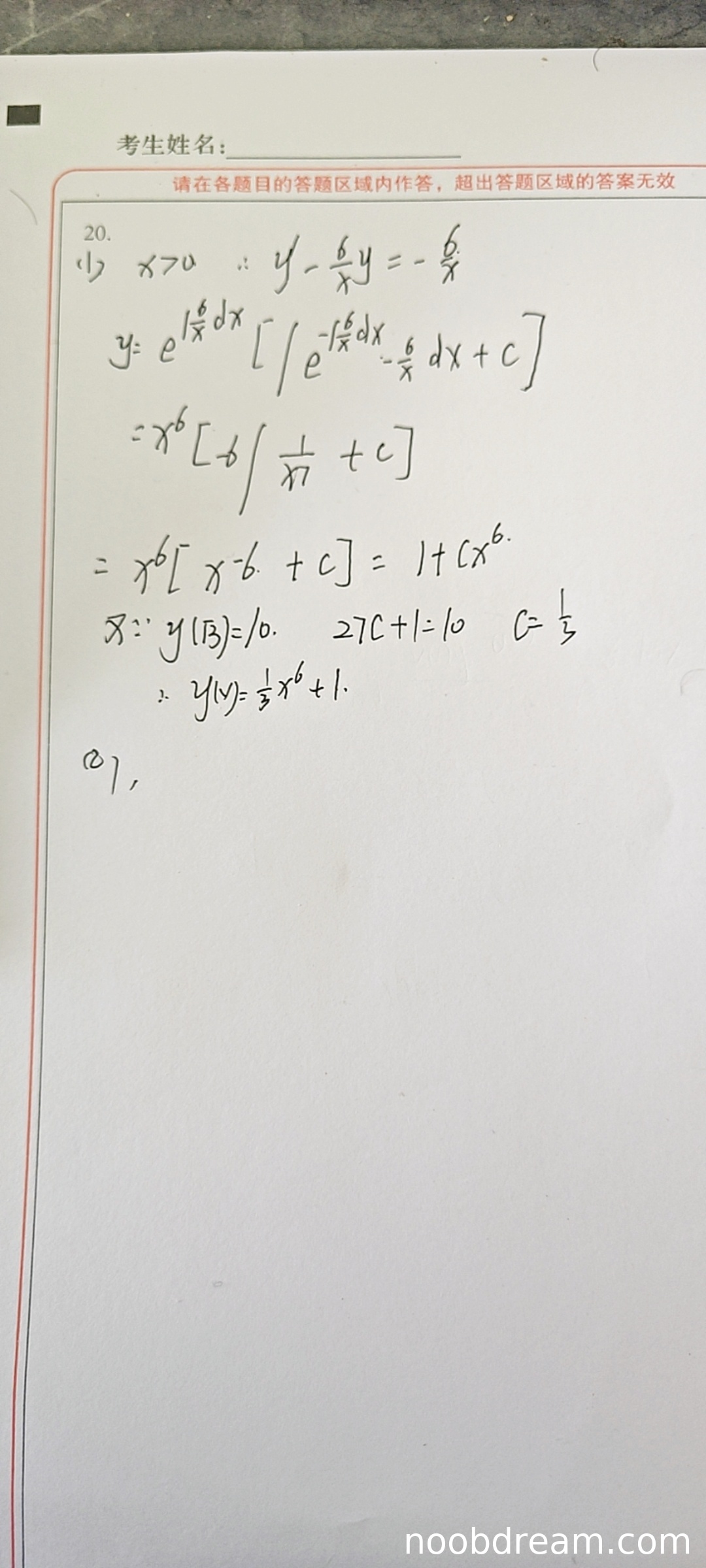学生第一次识别结果中,求解微分方程的过程正确,使用了积分因子法并得到了通解形式 y = 1 + Cx⁶。但在利用初始条件 y(√3) = 10 时,错误地将 x = √3 代入为 x = 3,导致计算错误得到 C = 1/3 而不是正确的 C = 1/81。这是一个逻辑错误,属于计算错误,扣2分。