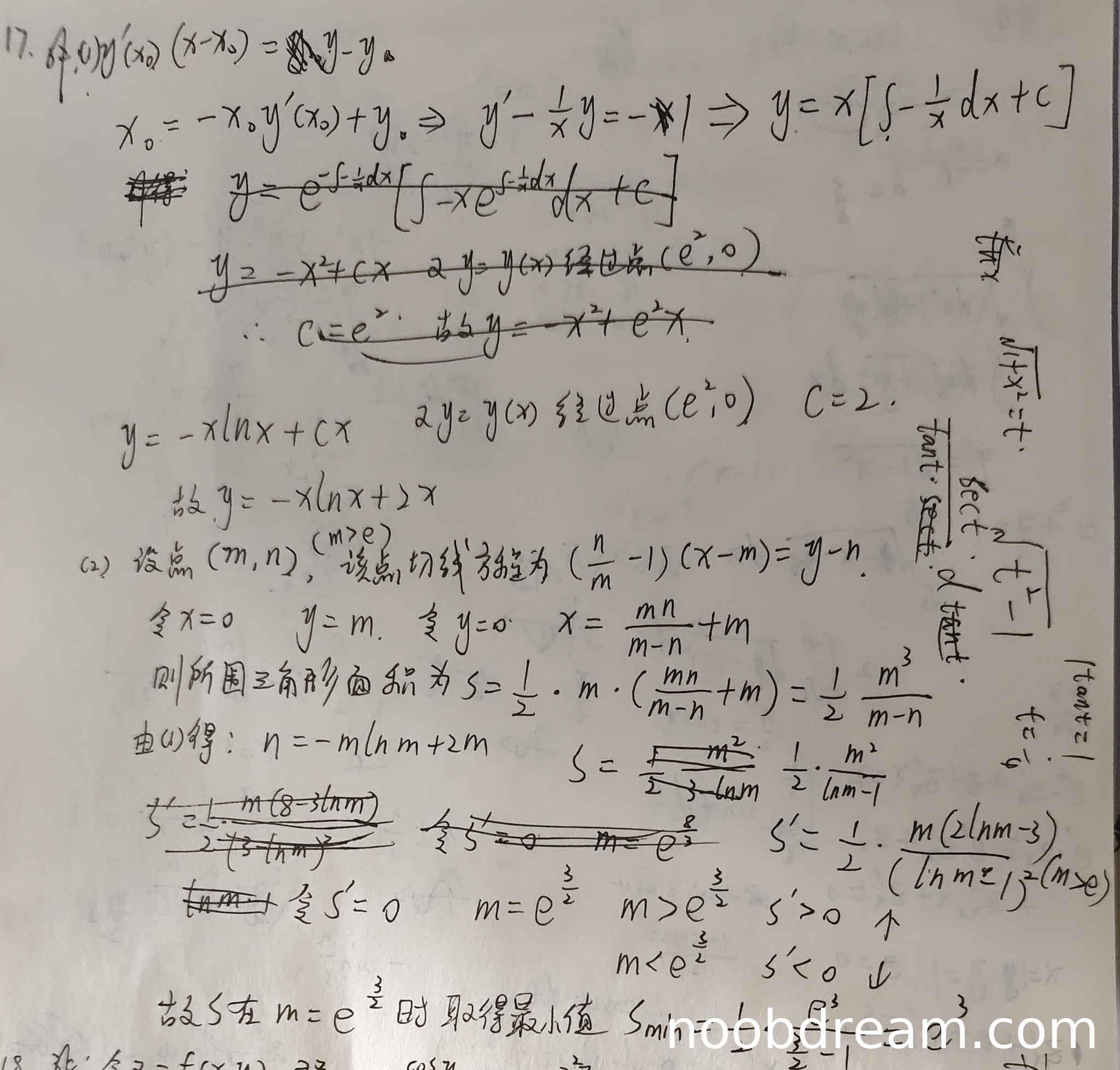 第2次识别中,学生在面积计算环节出现严重错误:y轴截距正确为m,但x轴截距计算错误为m/lnm+m(应为m/(lnm-1)),导致后续面积表达式和最小值计算全部错误。此为主要逻辑错误,扣3分。