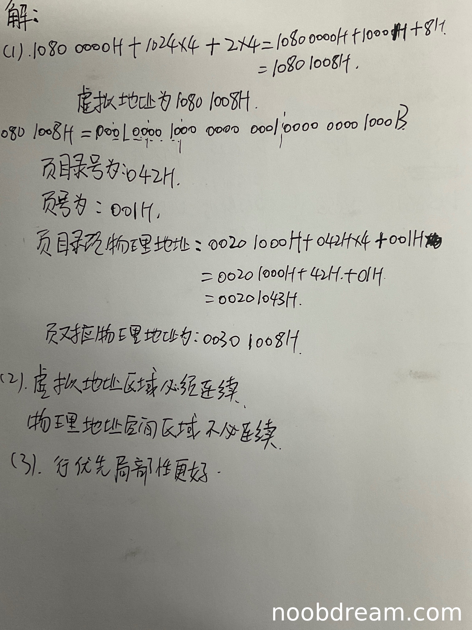 学生正确计算了虚拟地址为1080 1008H(1分),正确得到页目录号042H和页号001H(1分)。但在计算页目录项物理地址时出现错误:标准答案应为0020 1000H + 4×042H = 0020 1108H,学生计算为0020 1043H,这是逻辑错误(扣1分)。在计算页表项物理地址时,学生给出00301008H,但标准答案应为00301004H,这是逻辑错误(扣1分)。本小题得2分。