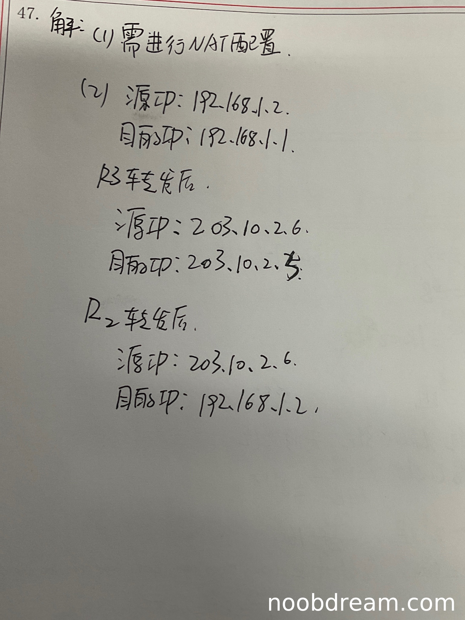 学生回答"需进行NAT配置",指出了关键配置,但未详细说明具体如何配置NAT转换表。标准答案要求明确R2开启NAT服务并设置转换表条目。由于学生回答过于简略,未能完整说明配置细节,但核心思路正确。扣1分。