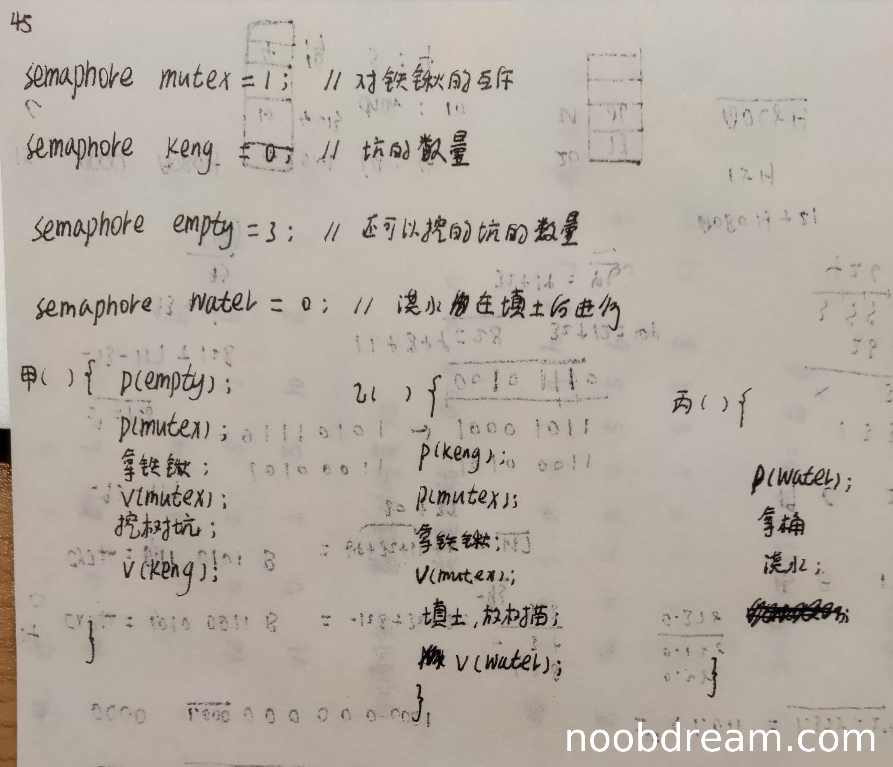 乙先P(keng)等待坑,再P(mutex)拿铁锹,但V(mutex)在填土放树苗之前释放了铁锹,而标准答案是在填土完成后释放。这里存在逻辑错误:填土操作需要使用铁锹,提前释放铁锹可能导致甲在乙填土过程中抢走铁锹挖坑,违反互斥。扣1分。其他部分正确,V(water)通知丙浇水,V(empty)(学生未写,但通过empty初值3和甲P(empty)隐含了控制)实际由甲P(empty)和乙未V(empty)导致坑数不恢复,这里标准答案有signal(sk)而学生缺失,属于逻辑错误。再扣1分。得0分。