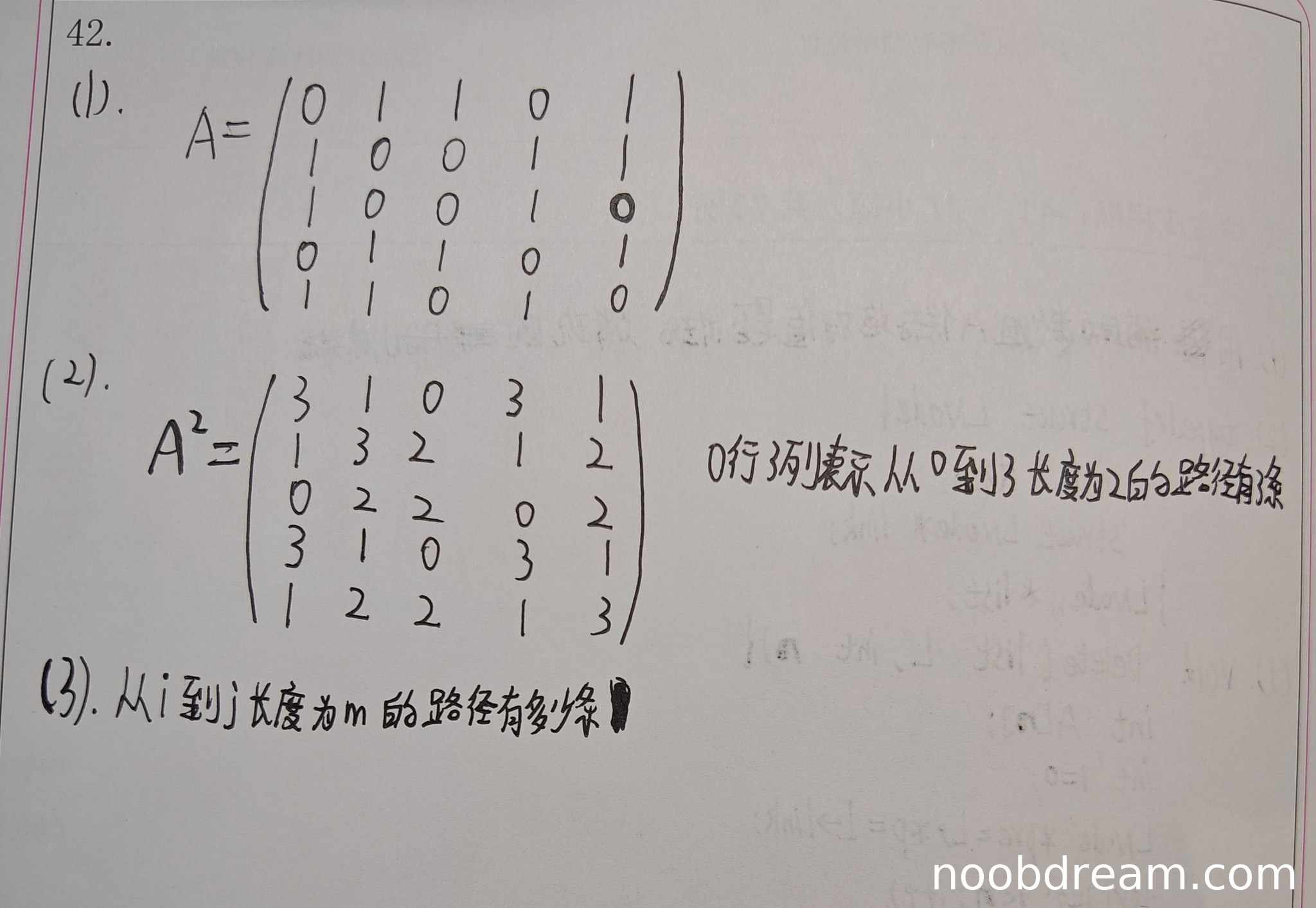 学生计算的A²矩阵与标准答案完全一致。对0行3列元素的解释基本正确,说明了"从0到3长度为2的路径",但缺少具体的数量"3条"。考虑到可能是识别问题或表述不完整,扣1分。得3分。