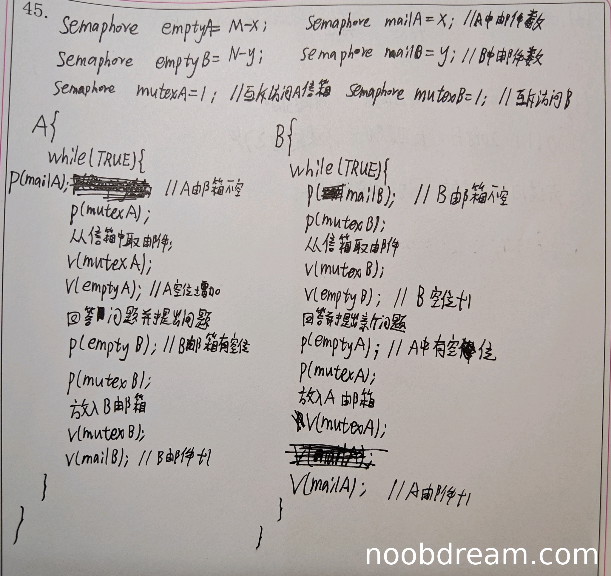 理由:同步逻辑完全正确:取邮件时先P(mailX)检查是否有邮件,然后V(emptyX)释放空间;放邮件时先P(emptyX)检查是否有空间,然后V(mailX)增加邮件计数。所有P、V操作顺序正确,没有死锁风险。