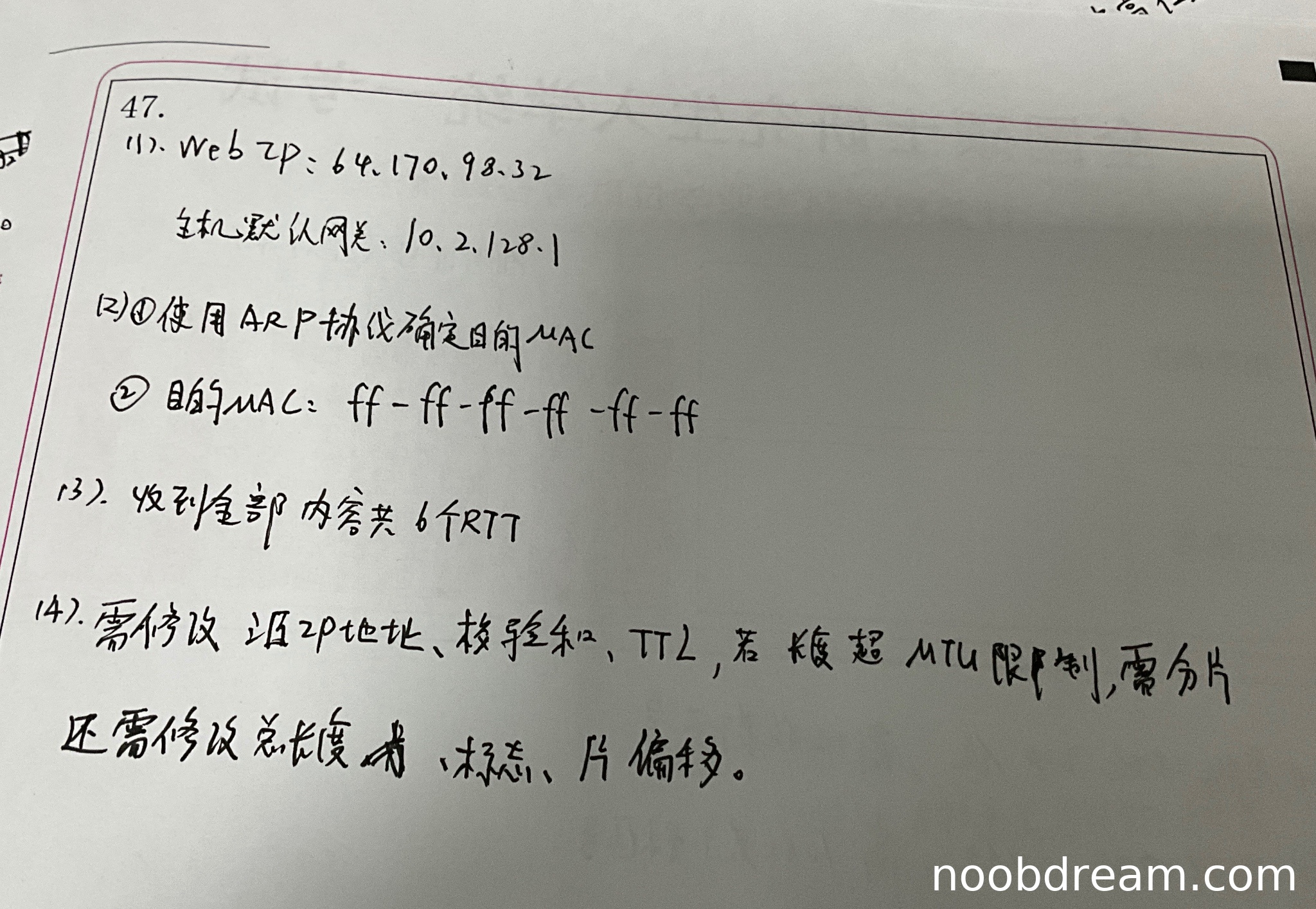 学生回答需修改源IP地址、校验和、TTL,这三项与标准答案一致,但标准答案中仅包含这三项(源IP地址、TTL、首部校验和)。学生额外提到“若超MTU限制,需分片”以及“修改总长度、标志、片偏移”,这些属于在特定情况下(IP分组长度超过MTU)才需要修改的字段,而题目并未给出此情境,因此属于多余信息。根据评分要求,多余信息不扣分,但本小题标准答案仅要求三项,学生回答中正确部分得3分(每项1分),额外部分不扣分也不加分。