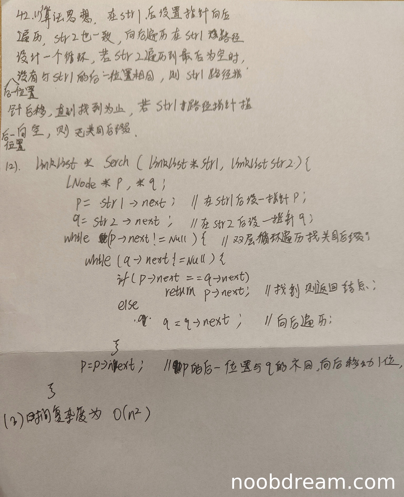 理由:学生的算法思想描述不清晰且存在逻辑问题。基本思路是使用双层循环遍历两个链表,通过比较每个结点的后继指针是否相同来寻找共同后缀起始位置。这种方法虽然能解决问题,但效率较低(O(n²)),且描述中"str1的后一位置"等表述不够准确。与标准答案中先计算长度差再同步遍历的高效方法(O(m+n))相比,设计思想不够优化,因此扣3分。