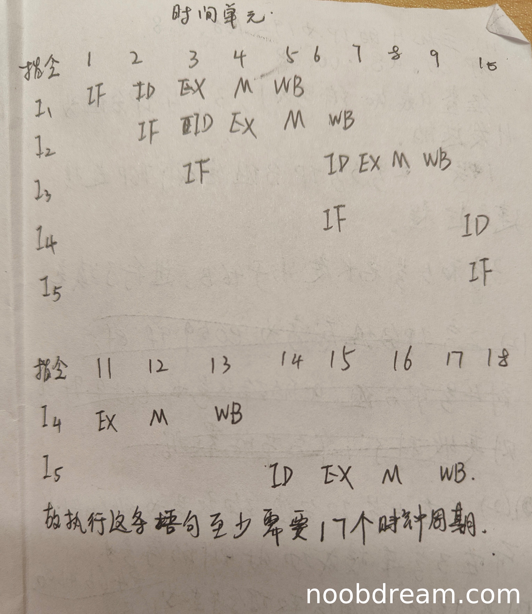 但学生提供的流水线时序图不完整(只画到10周期,且I3、I4、I5的流水段安排错误),没有正确反映数据相关导致的阻塞。标准答案需要17周期,学生虽文字说明需要17周期,但图示未正确体现。扣2分。