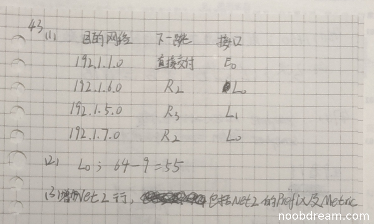 由于学生没有进行路由聚合,路由项多于要求的最少数量,且192.1.6.0/24和192.1.7.0/24分别列出不符合"路由项尽可能少"的要求。但核心网络路径正确,因此给4分(扣2分)。