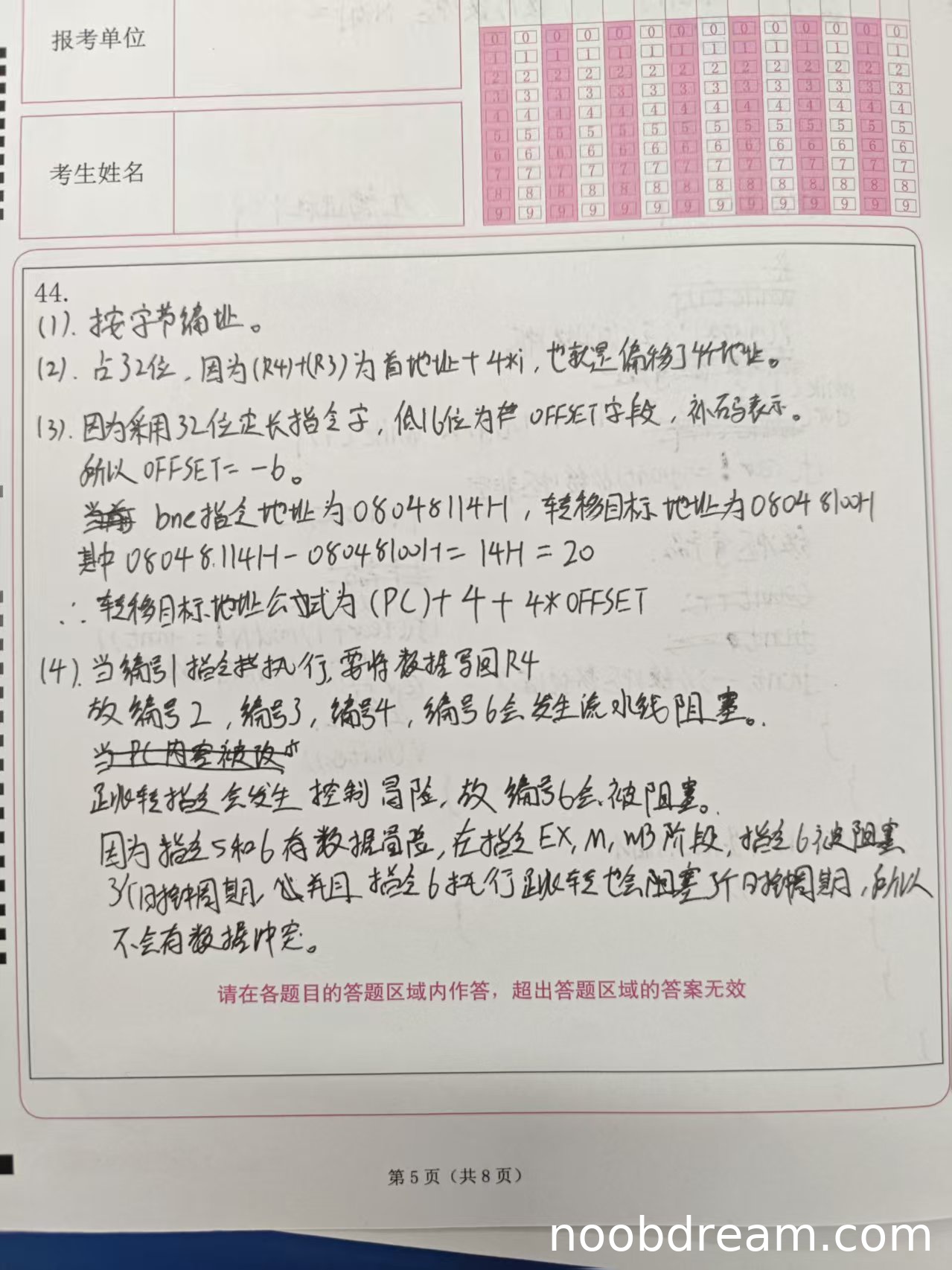 学生正确得出OFFSET=-6(1分),但在第二次识别中转移目标地址计算错误(写为08048104H,应为08048100H),导致偏移量计算有误。但学生给出的转移目标地址公式“(PC)+4+4×OFFSET”与标准答案一致(1分)。由于偏移量计算错误,但公式正确,扣1分。本小题得2分。