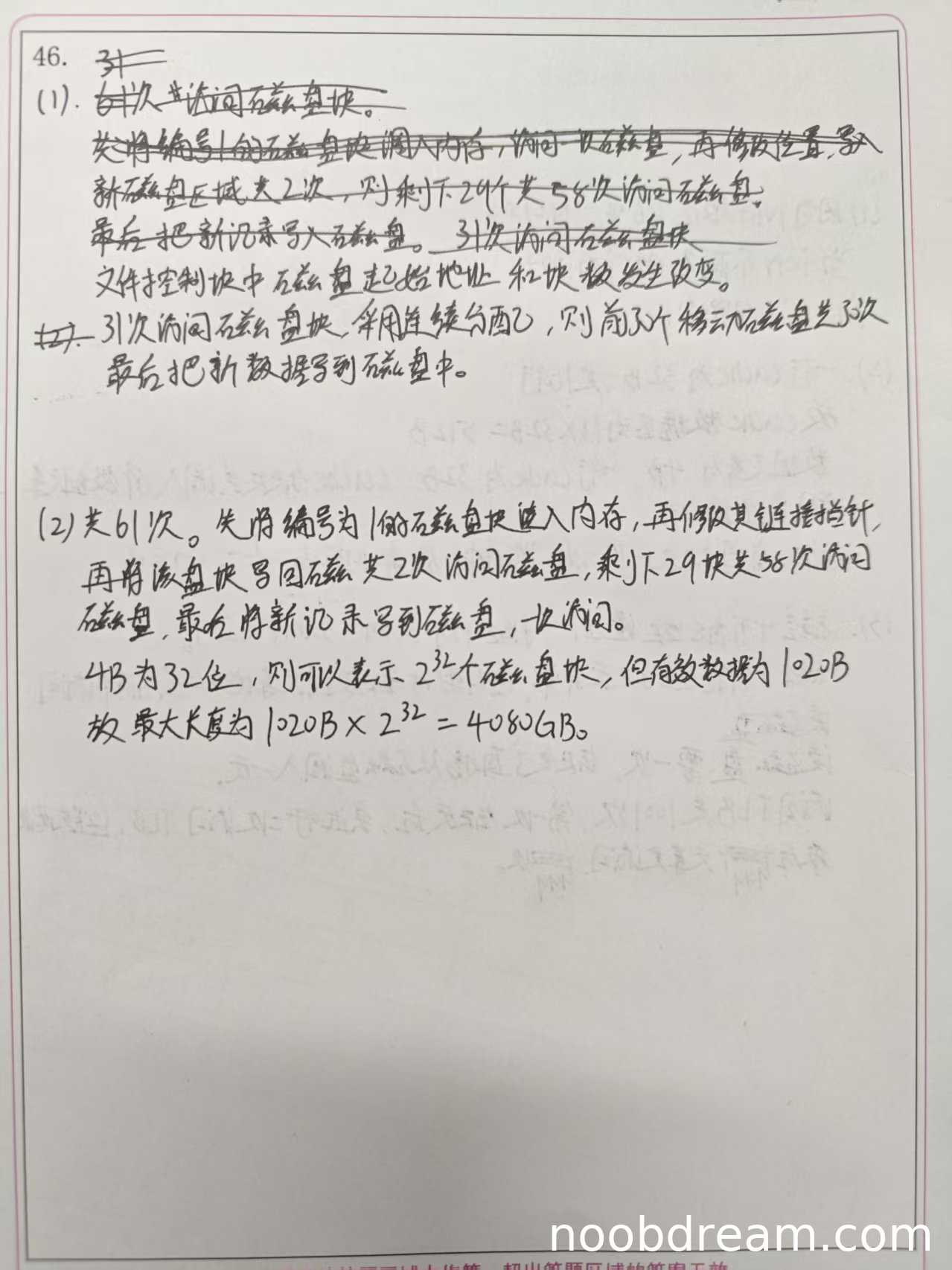 学生答案中链接分配方式的磁盘访问次数计算存在逻辑错误。学生两次识别都提到"共61次"访问磁盘,这与标准答案的31次相差较大。虽然学生理解了需要修改指针的操作过程,但计算逻辑错误。文件最大长度部分回答正确,计算过程和结果(4080GB)都与标准答案一致。因此磁盘访问次数部分扣2分,文件最大长度部分得2分,本小题得2分。