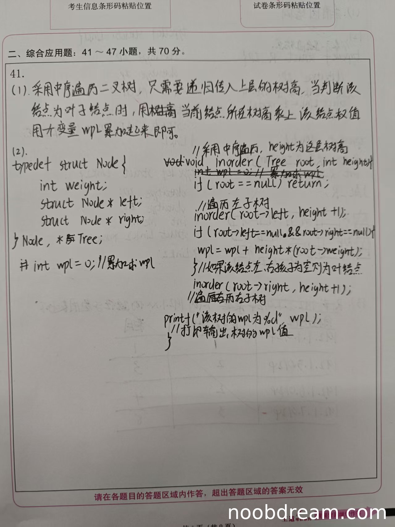 理由:学生提出使用中序遍历二叉树,通过递归传入上层树高,在叶子结点处计算带权路径长度并累加。基本思路正确,能够实现WPL的计算。但题目要求的是先序遍历或层次遍历,中序遍历虽然也能计算WPL,但不符合题目要求的遍历方式,因此扣1分。