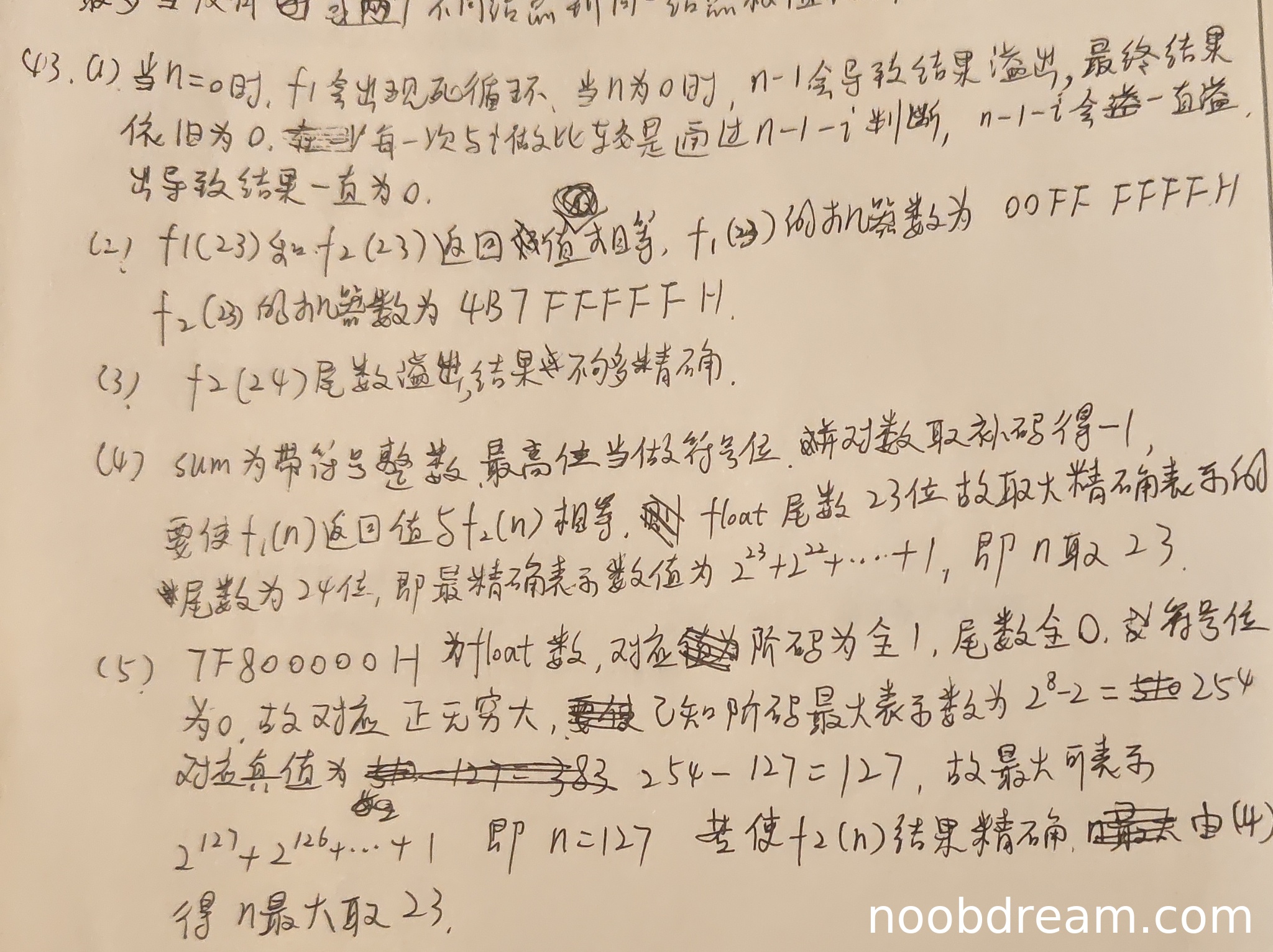 学生未解释f1(31)返回-1的原因(int溢出补码表示),且错误地将问题关联到float尾数(标准答案基于int型表示范围),逻辑错误。第二部分学生回答n取23(标准答案为30),完全错误。扣2分,得0分。