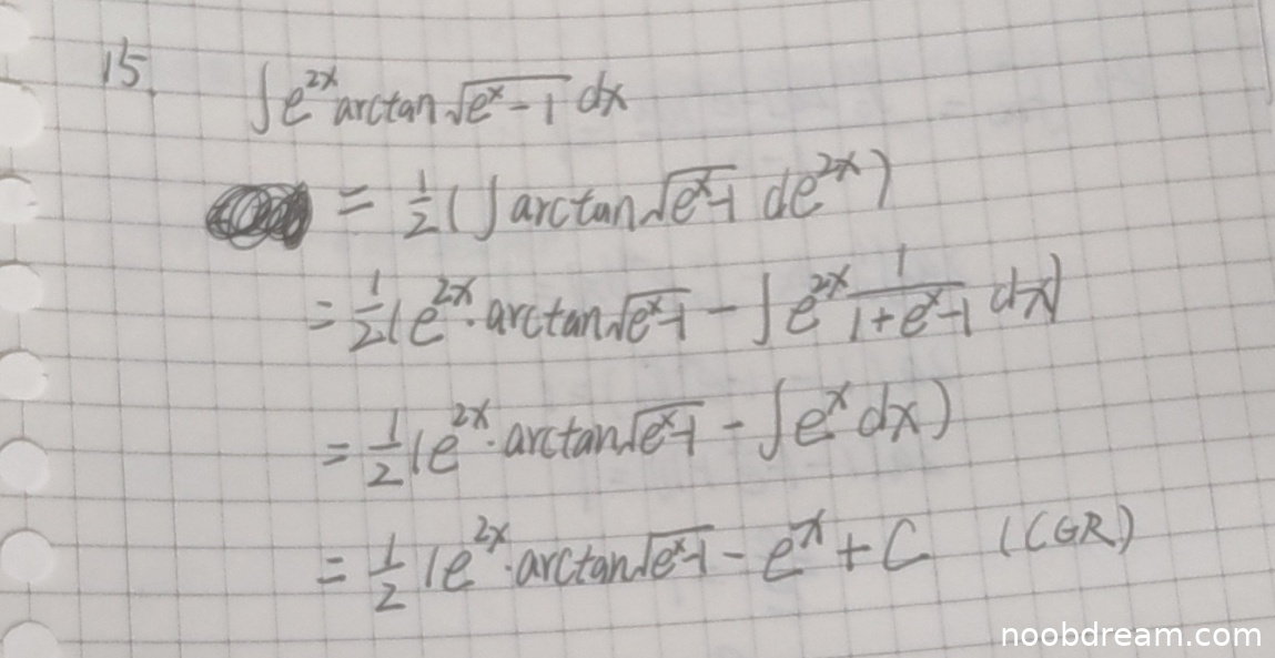 - 在分部积分后的积分项中,学生错误地将 \( \int e^{2x} \cdot \frac{1}{2\sqrt{e^x-1}} \cdot 2\sqrt{e^x-1} dx \) 简化为 \( \int \frac{e^{2x}}{1+e^x-1}dx \),这步简化错误,导致后续积分变为 \( \int e^x dx \),而标准答案中应为 \( \int \frac{e^{2x}}{2\sqrt{e^x-1}} dx \)。