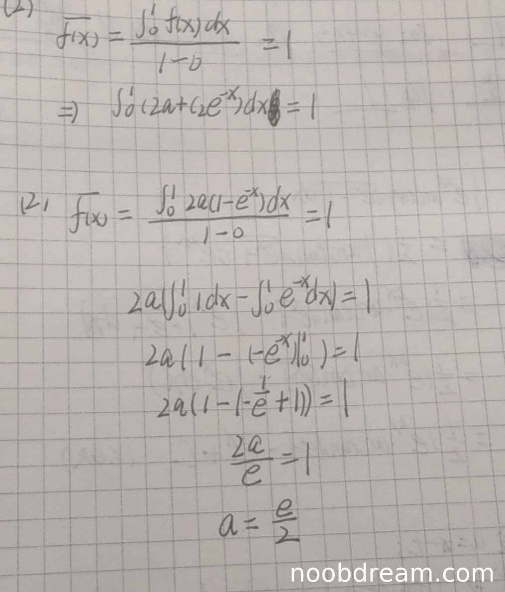 在第2次识别结果中,学生正确使用了平均值公式,代入自己求得的 \(f(x) = 2a(1-e^{-x})\),计算积分过程正确,最终得到 \(a = \frac{e}{2}\),与标准答案一致。但在计算过程中,有一步写成了 \(\int_0^1 (2a + C_2 e^{-x}) dx = 1\),这与前面的 \(f(x)\) 表达式不一致,可能是笔误,根据规则不扣分。得5分。
