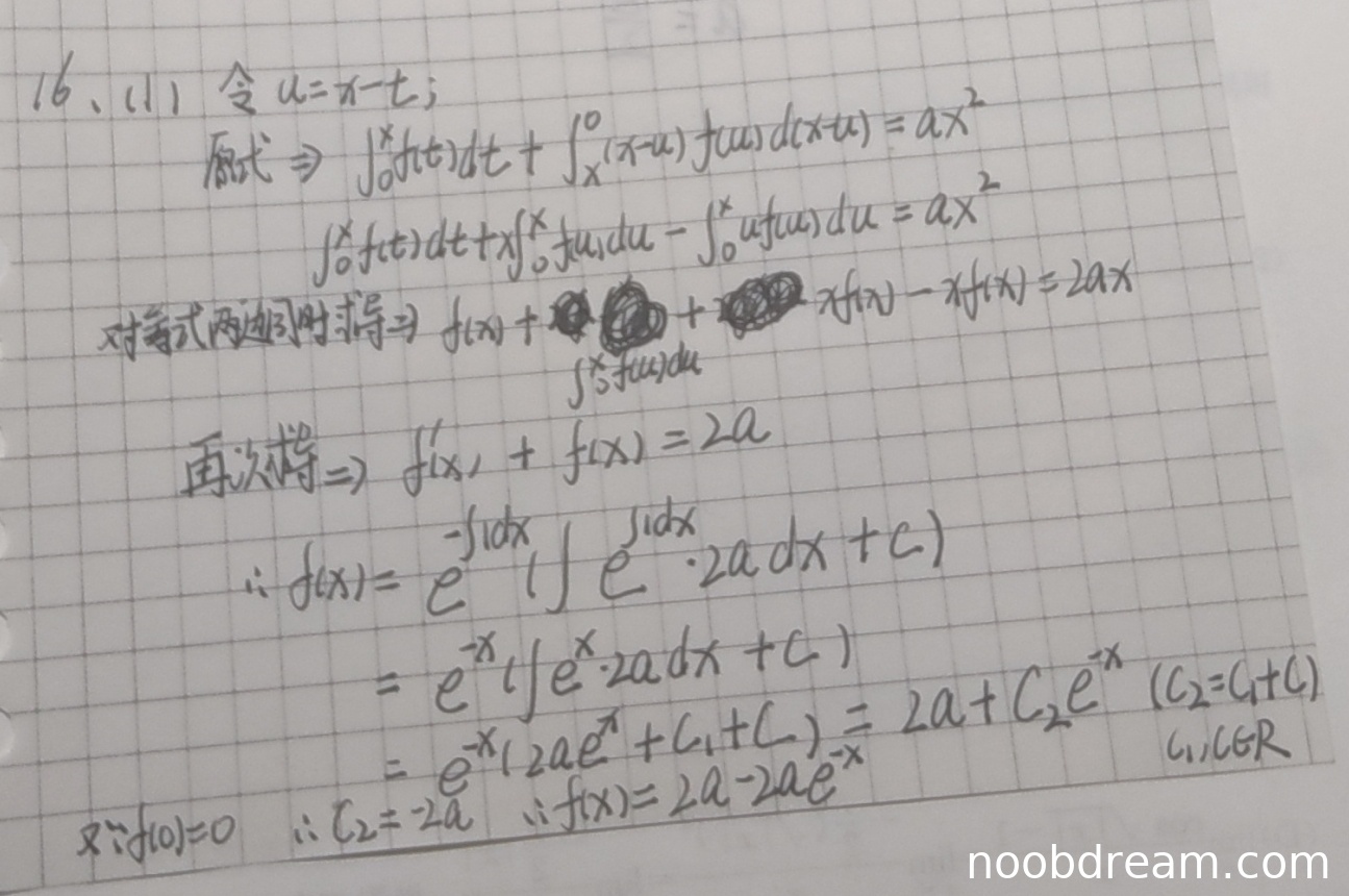 第2次识别结果中,学生正确进行了变量代换,得到正确的积分表达式。在求导过程中,第一次求导时正确得到 \(f(x) + \int_0^x f(u)du = 2ax\),但第二次求导时,学生写的是 \(f'(x) + f(x) = 2a\),这实际上是错误的,因为对 \(\int_0^x f(u)du\) 求导应该得到 \(f(x)\),所以应该是 \(f(x) + f(x) = 2a\) 即 \(2f(x) = 2a\),从而 \(f(x) = a\)。但学生错误地得到了一个微分方程并求解,虽然求解过程正确,但基于错误的前提。不过,学生利用 \(f(0) = 0\) 的条件,最终得到 \(f(x) = 2a(1-e^{-x})\),这与标准答案一致。考虑到最终结果正确,且主要错误在于求导步骤,但整体思路和最终答案正确,扣1分。得4分。