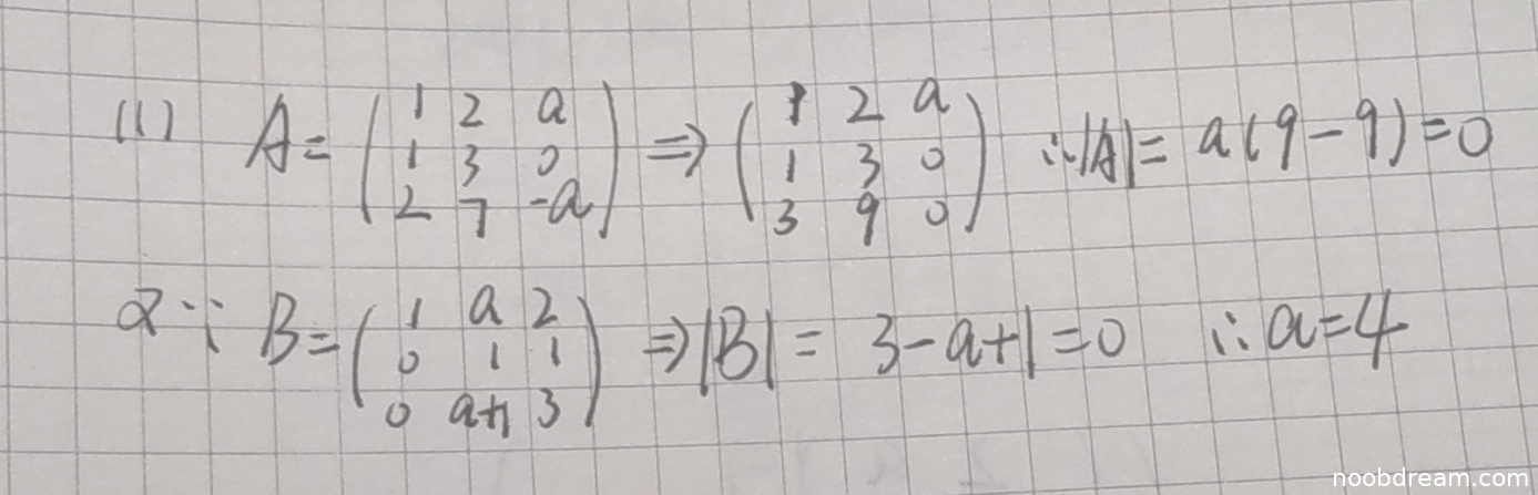 学生答案中通过计算行列式的方法判断可逆矩阵P存在的条件,思路是合理的,因为若存在可逆矩阵P使AP=B,则A和B的秩必须相等。但学生在计算行列式时出现了错误: