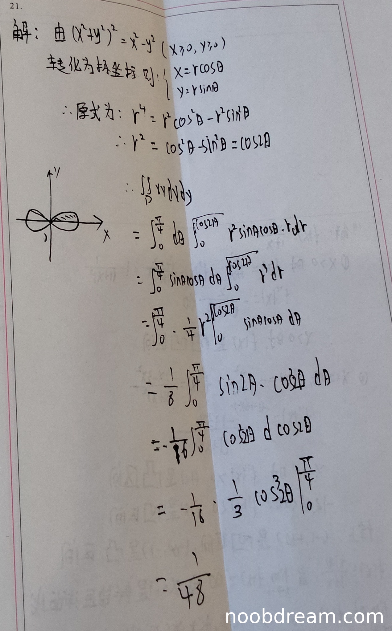 学生作答与标准答案基本一致,使用了极坐标变换,正确确定了积分区域和积分限。计算过程中,从极坐标变换到积分计算步骤完整,最终结果正确。虽然在第4步中出现了“\(\int_{0}^{\frac{\pi}{4}}\cdot\frac{1}{4}r^{4}\big|_{0}^{\sqrt{\cos2\theta}}\sin\theta\cos\theta\mathrm{d}\theta\)”这样的写法(多了一个点乘号),但这可能是书写或识别问题,不影响核心逻辑。后续计算正确,最终得到正确答案\(\frac{1}{48}\)。根据评分要求,思路正确且计算无误,应给满分。