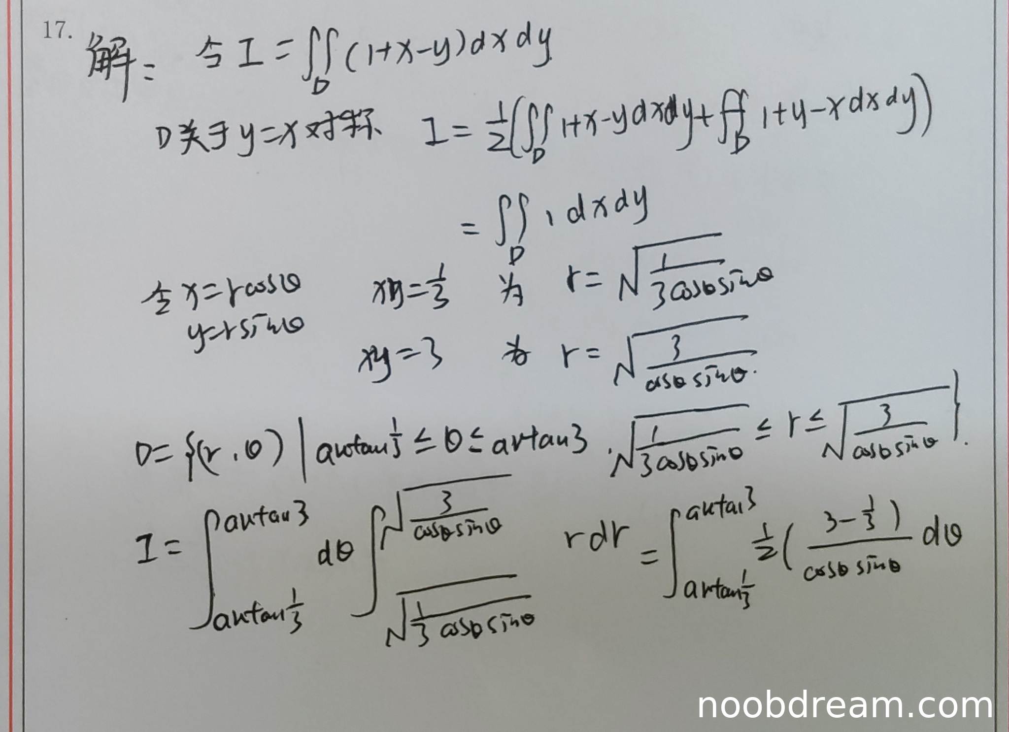在对称性化简部分,学生正确利用了区域关于y=x对称的性质,将原积分化简为∬D1dxdy,这一步思路正确且表述清晰。