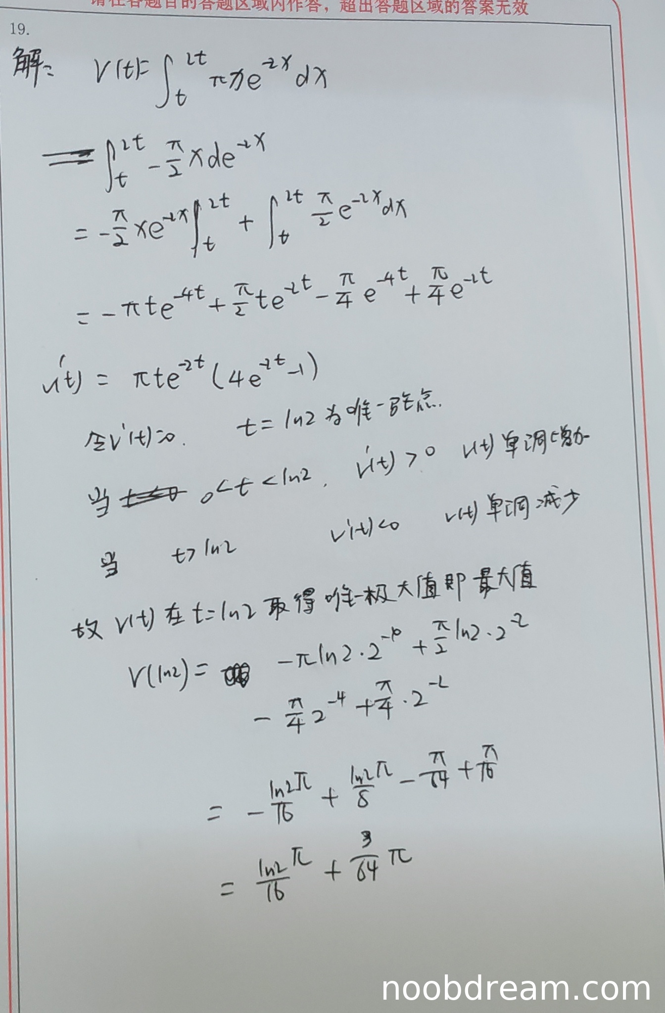 - 第一次识别中,初始体积公式写为 \( V(t)=\int_{t}^{2t} \pi x e^{2x} dx \),应为 \( e^{-2x} \),但后续计算中实际使用了 \( e^{-2x} \),可能是识别错误或笔误,根据“误写不扣分”原则,不扣分。
